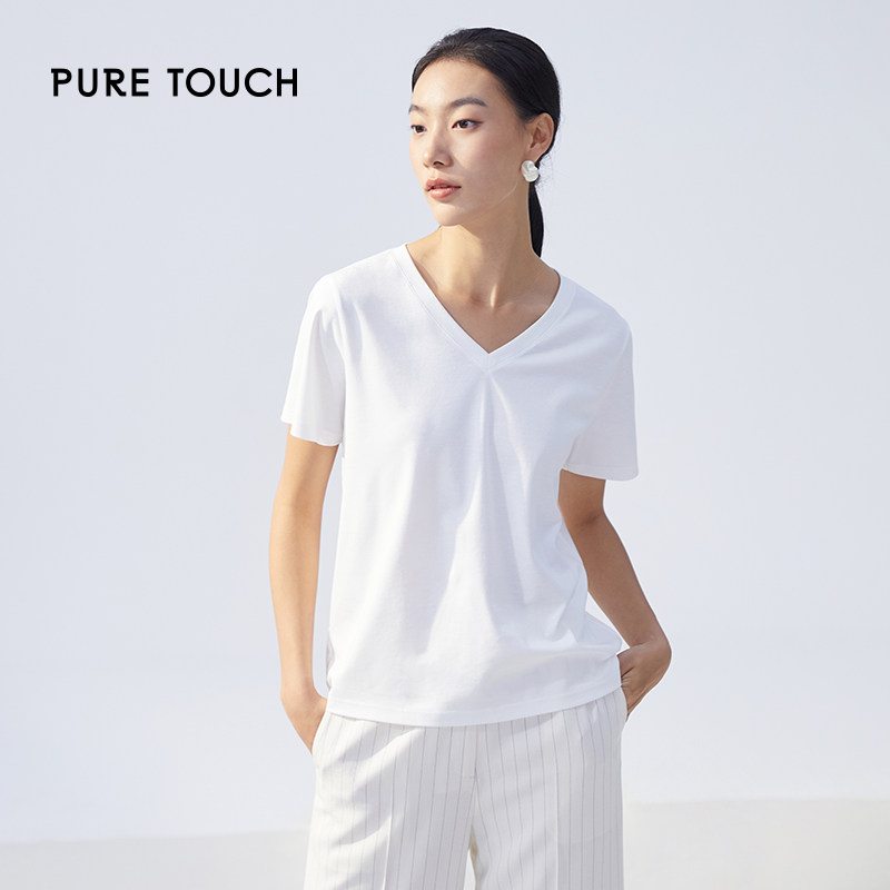 T恤女内搭半袖 V领短袖 百搭直筒基础白T棉麻混纺 touch夏季 pure