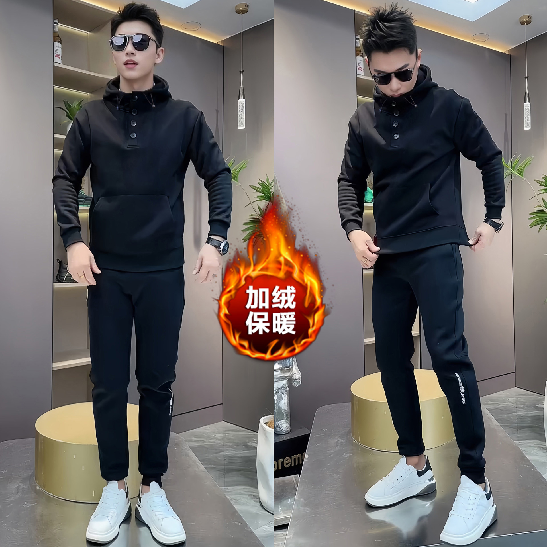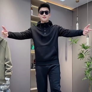 加绒保暖口袋百搭圆领卫衣男宽松拼接针织打底衫 高街美式 秋冬新款