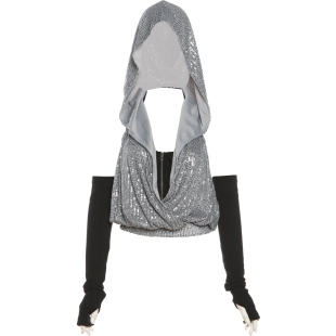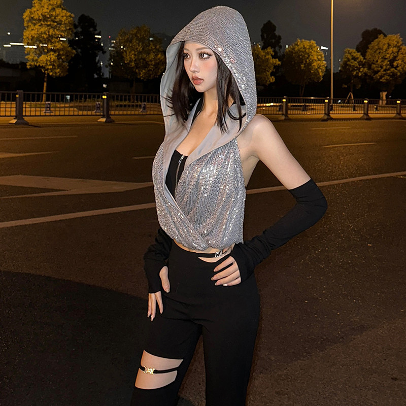 连帽亮片宽松罩衫 怪诞女孩 套背心时尚 废土风拉链设计带袖 女 个性
