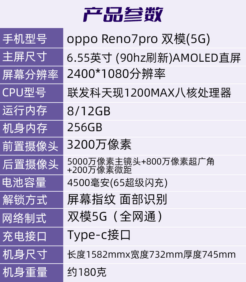 5G天玑1200MAX Pro 6.55英寸带呼吸灯5G智能手机 Reno7 OPPO