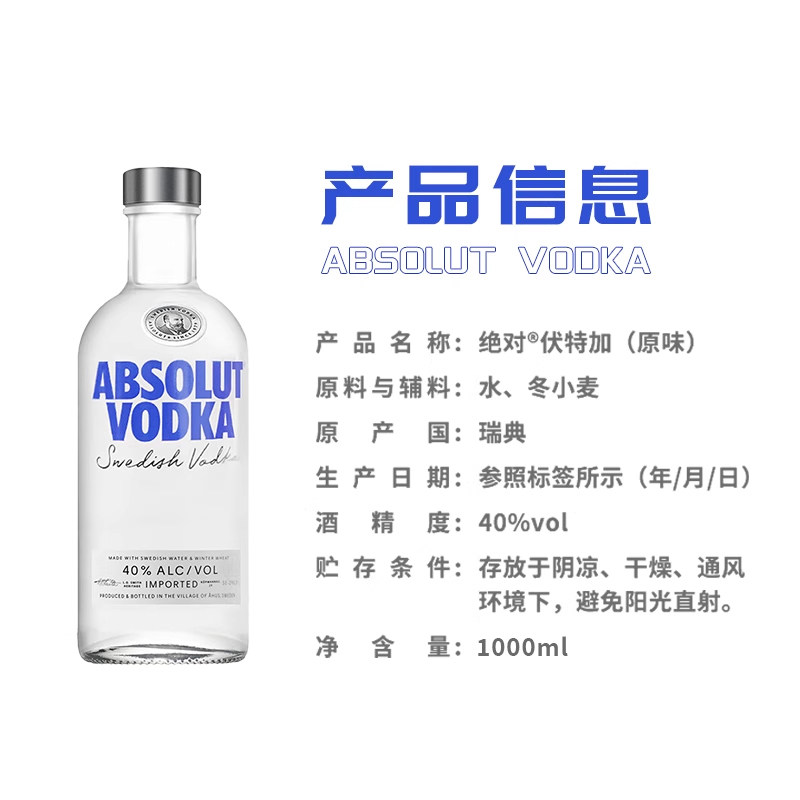 绝对伏特加瑞典伏特加原味ABSOLUT 进口洋酒1000ml VODKA原装