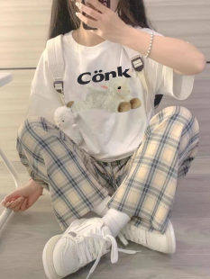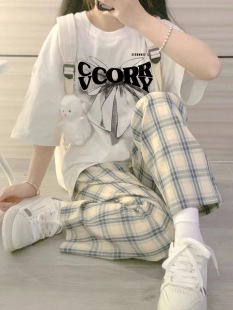 t恤休闲格子裤 学院风运动套装 宽松短袖 新款 两件套ins 女小个子夏季