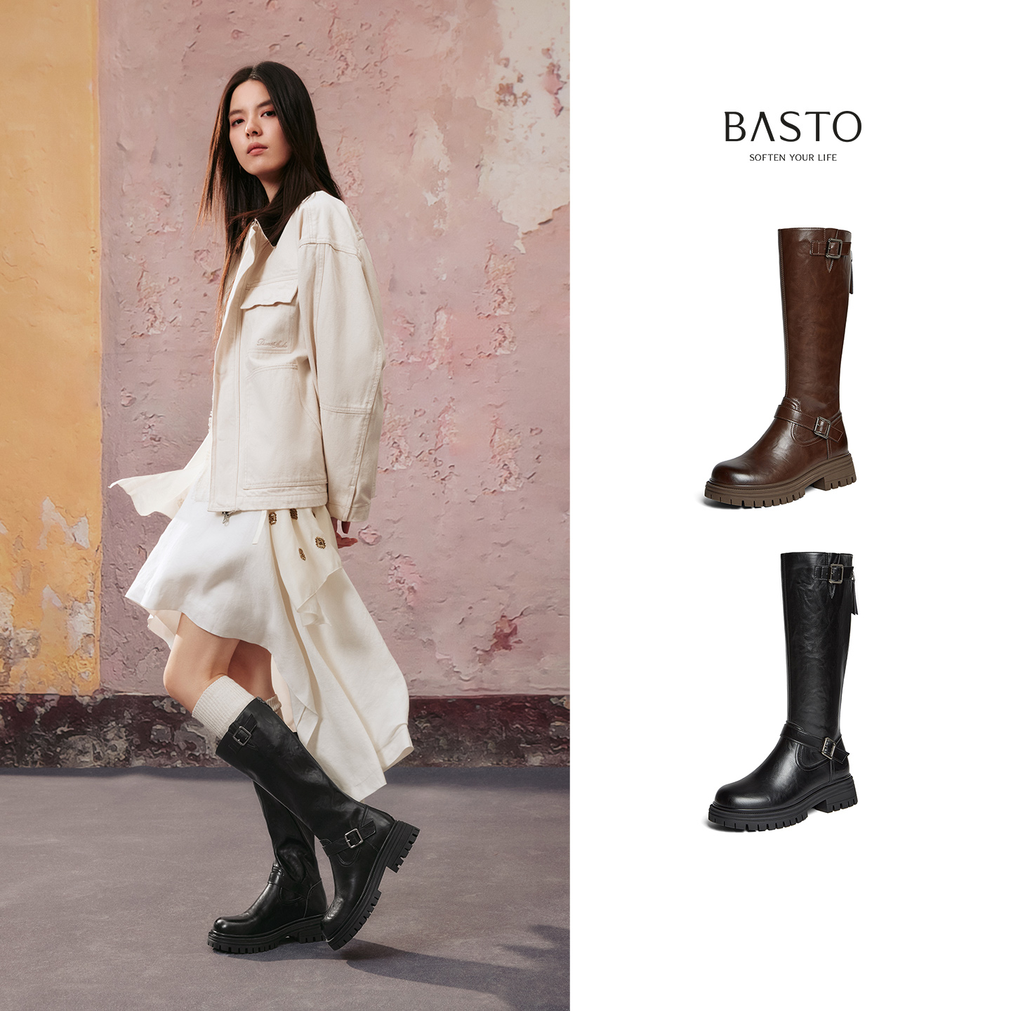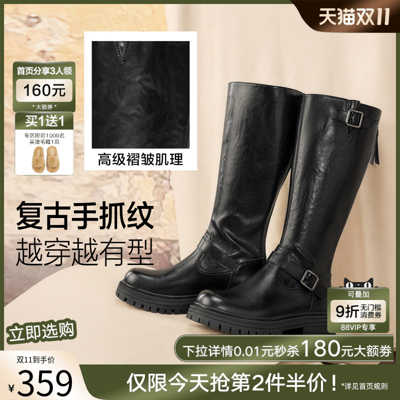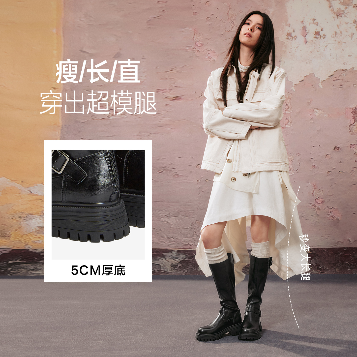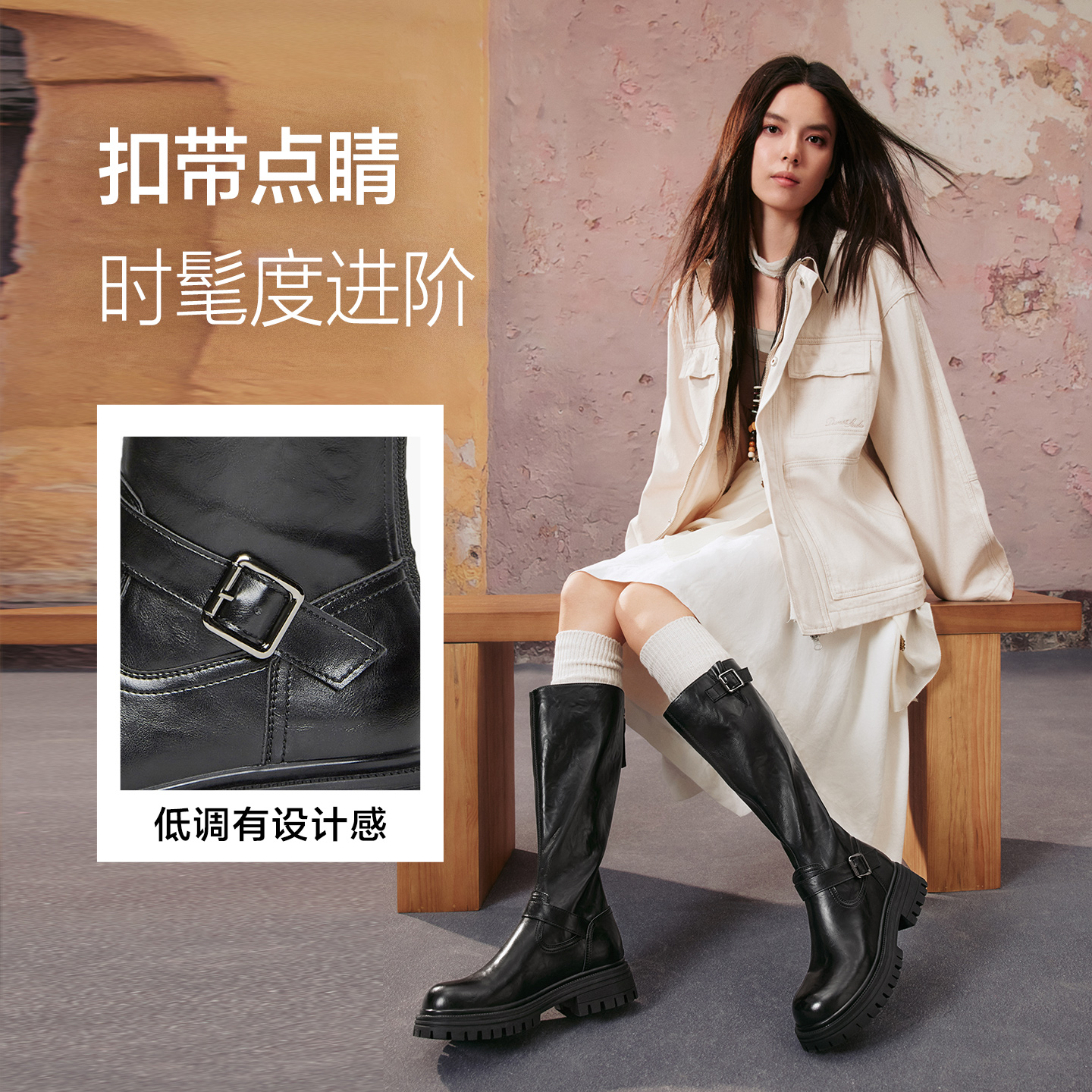百思图2025冬季 加绒厚底扣带骑士靴通勤粗跟女长靴F2032DG5 新款