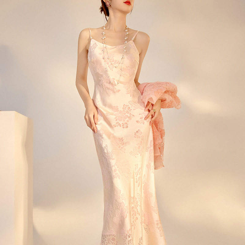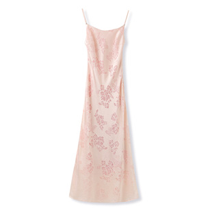 国风气质吊带连衣裙人丝提花刺绣长款 过膝a字感吊带裙女m6068