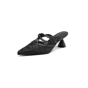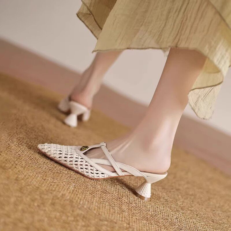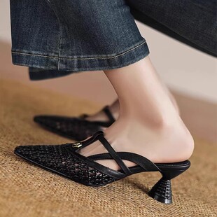 2025新款 尖头编织镂空5.5厘米高跟包头凉拖女夏外穿真皮半拖 时尚