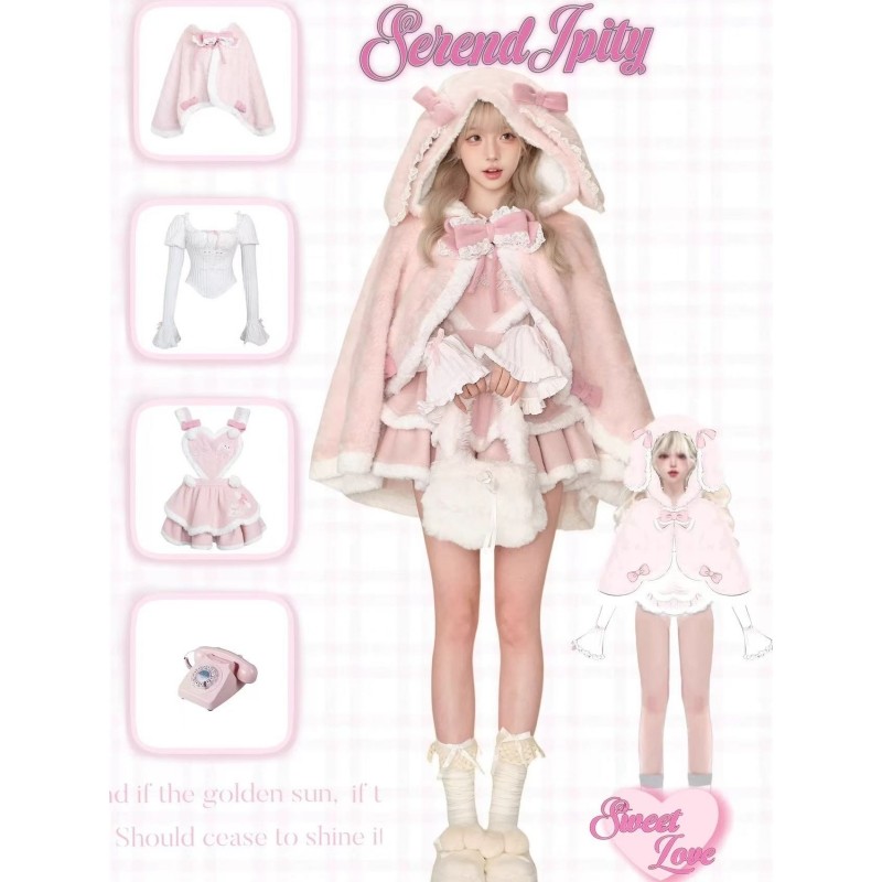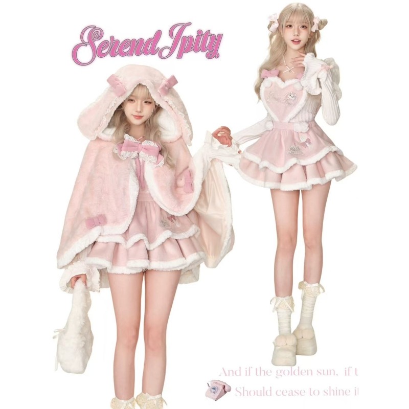 冬日少女甜美毛绒兔耳斗篷外套可爱蝴蝶结粉色背带蛋糕裙三件套裙