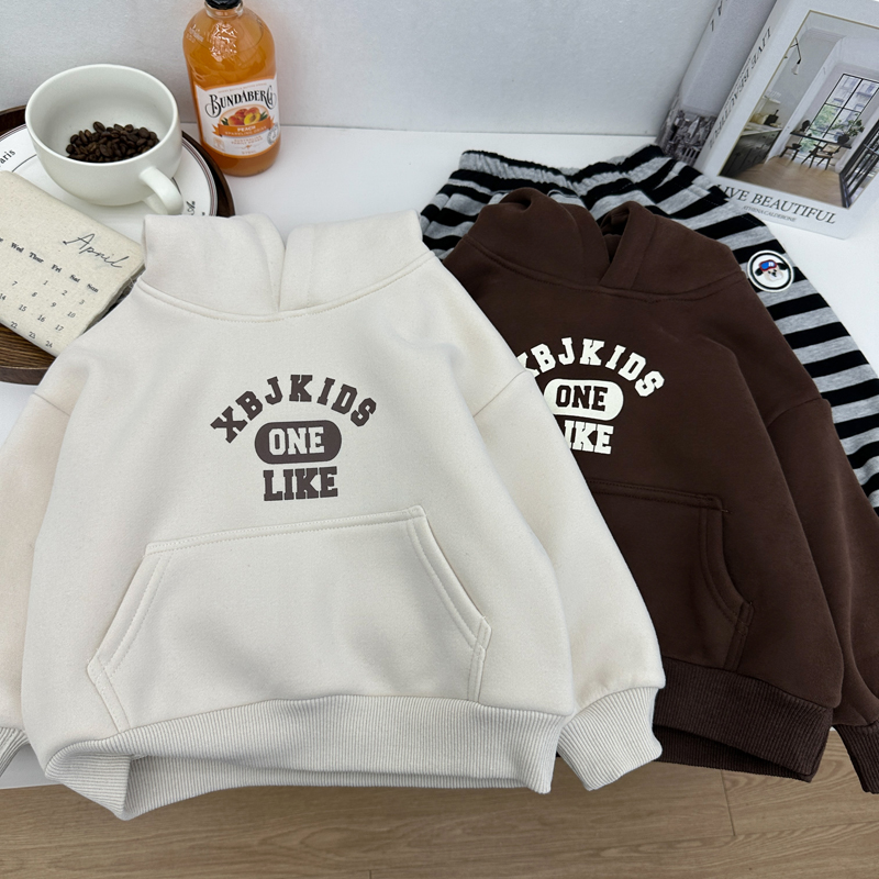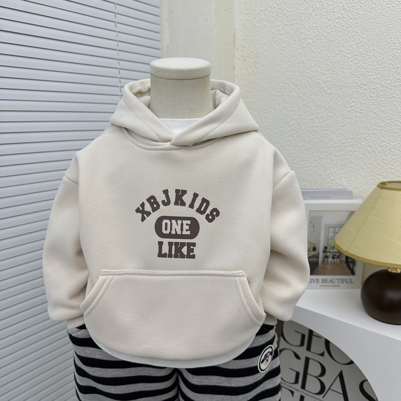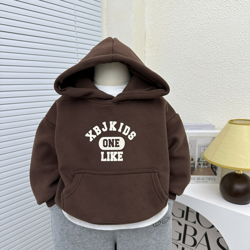 儿童休闲百搭上衣 洋气一体绒连帽衫 男童秋冬加绒卫衣2024新款 韩版