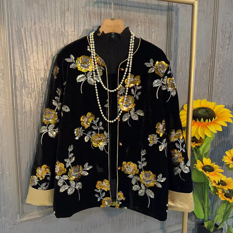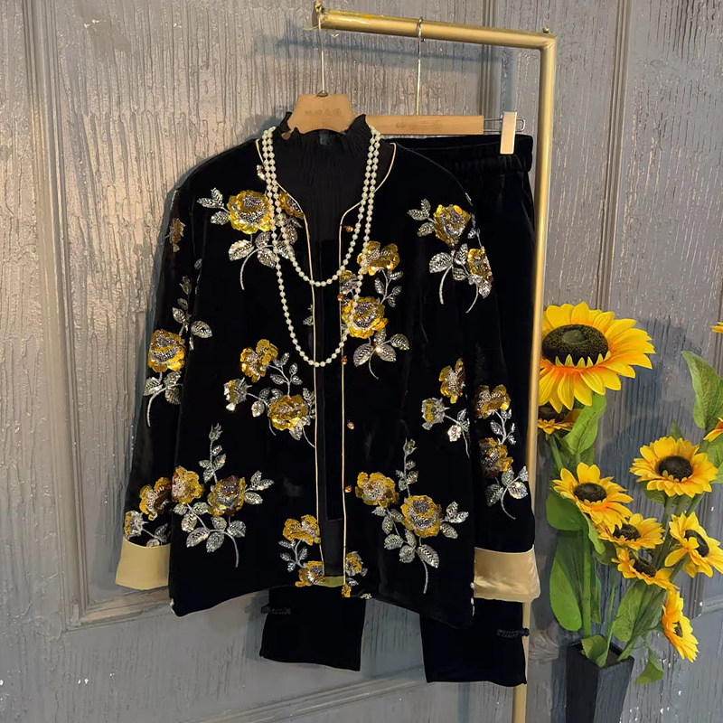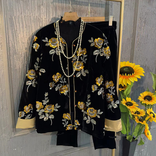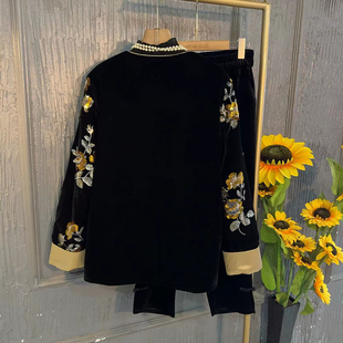 子 脚丝绒裤 加肥圆领拼色袖 口刺绣花朵国风外套胖妹妹松紧腰盘扣裤