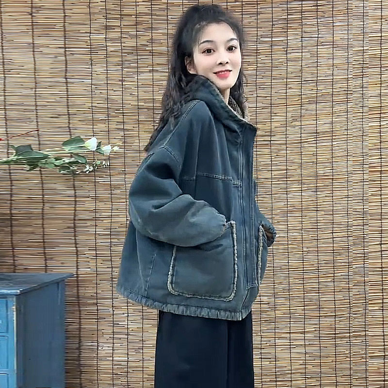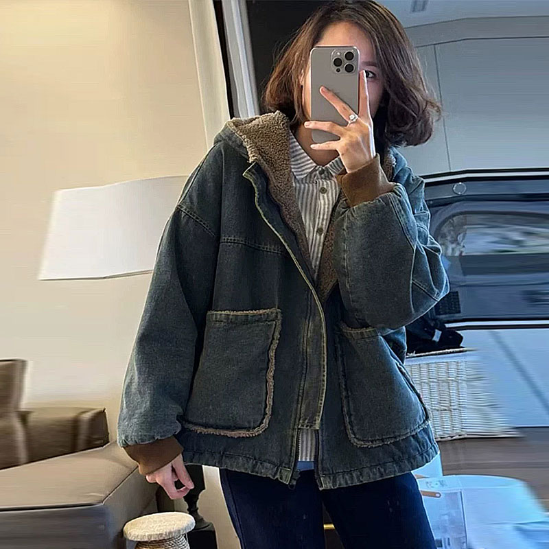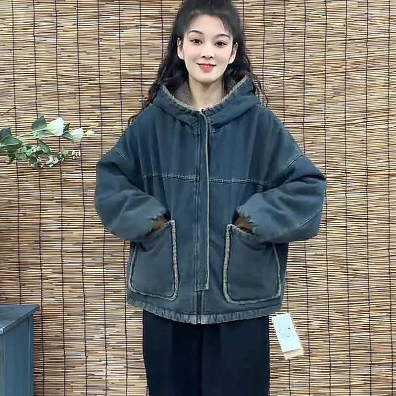 2025冬新款 两面穿连帽加绒加厚牛仔外套休闲百搭宽松显瘦保暖棉服