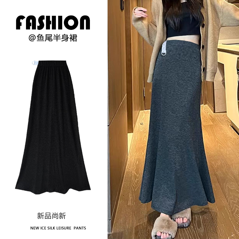 娅丽达松紧腰醋酸毛呢半身裙女秋冬2025新款 黑色裙子开叉直筒长裙