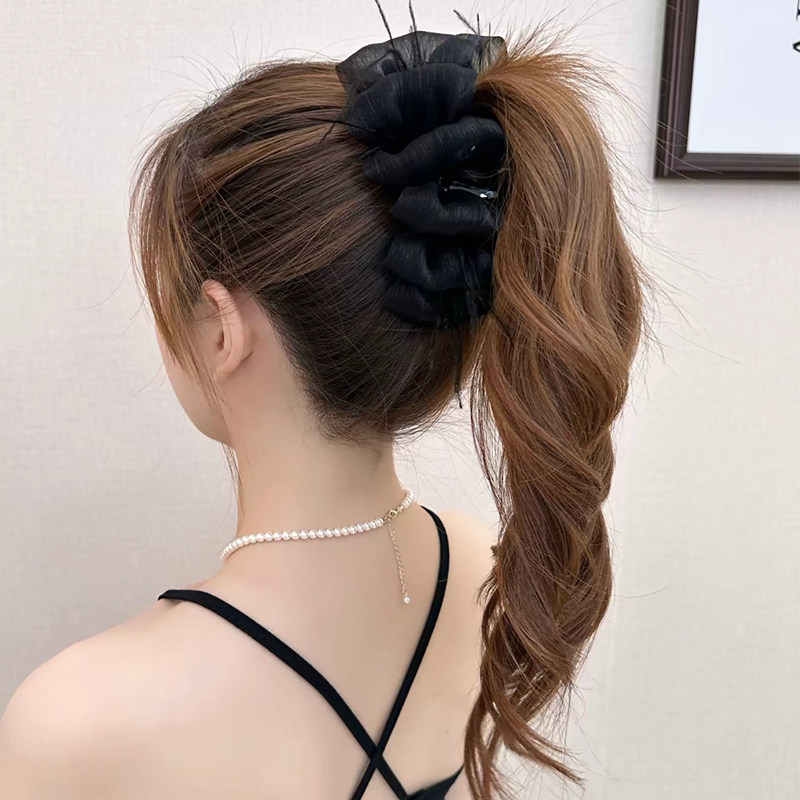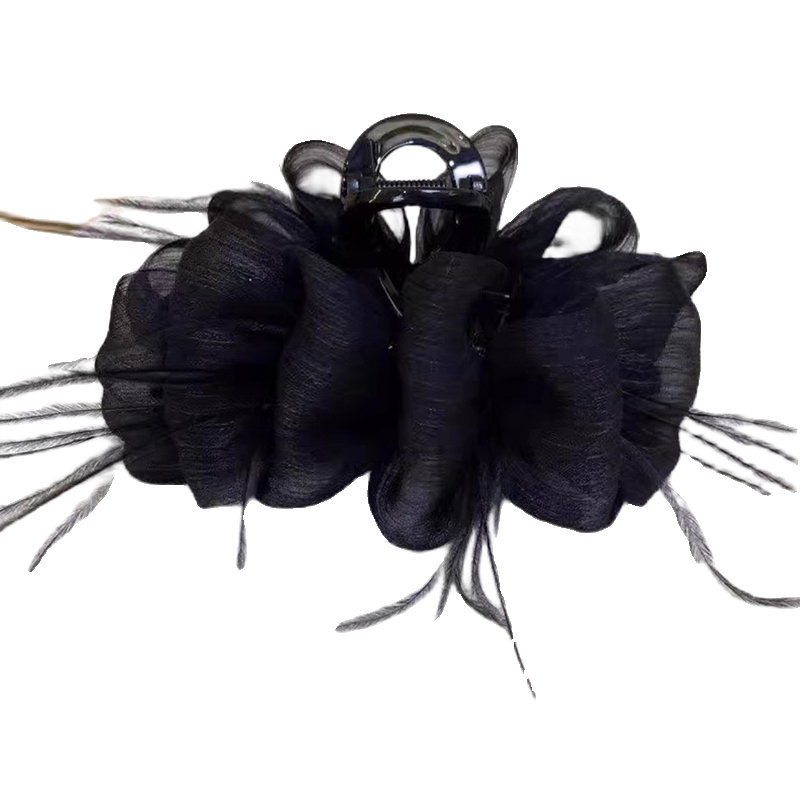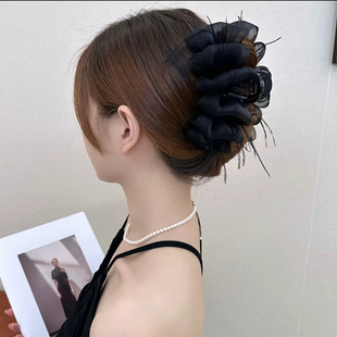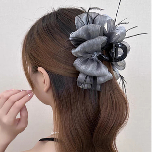 新款 羽毛云朵泡泡网纱抓夹女高级感盘发大号鲨鱼夹头饰发夹显发量