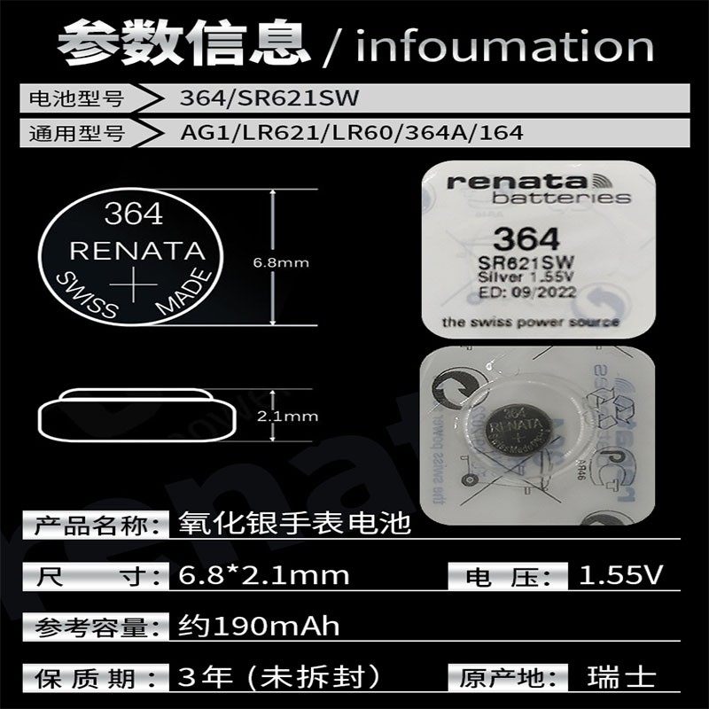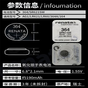 LR60 AG1 164氧化银纽扣电子 Renata瑞士364手表电池SR621SW 原装