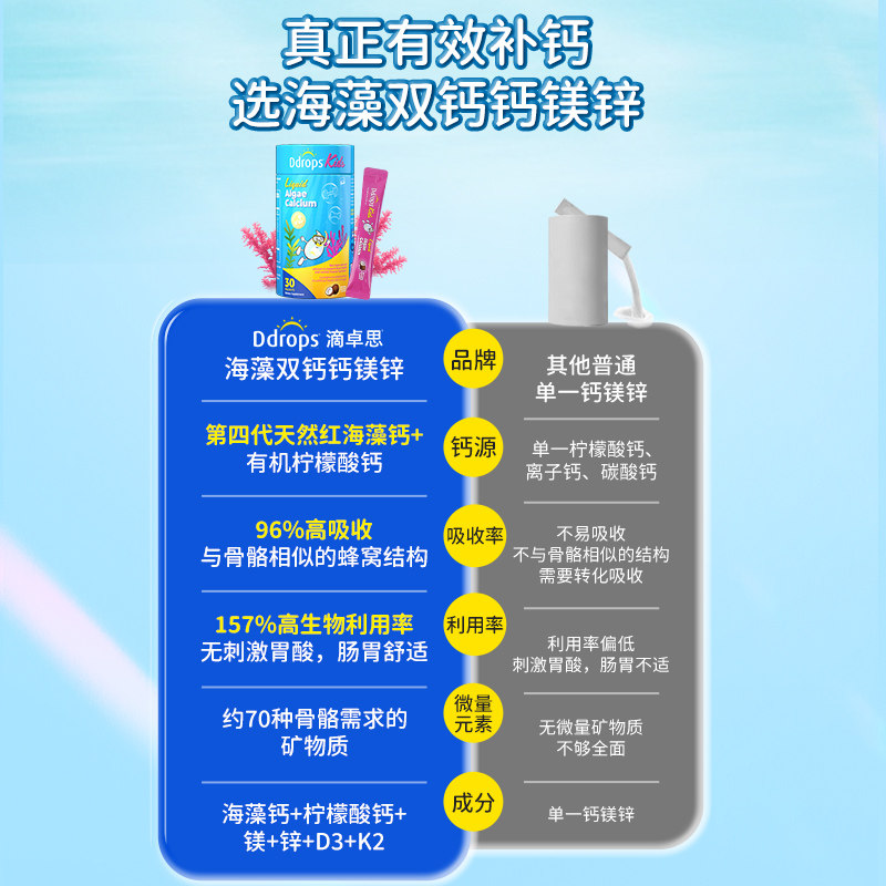 Ddrops滴卓思钙镁锌儿童补钙补锌d3宝宝婴幼儿钙铁锌海藻钙液体钙