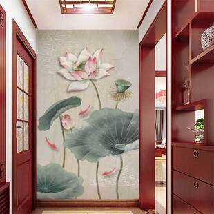 墙纸3d立体中式 古典荷花玄关背景墙壁纸客厅壁布卧室墙布别墅壁画