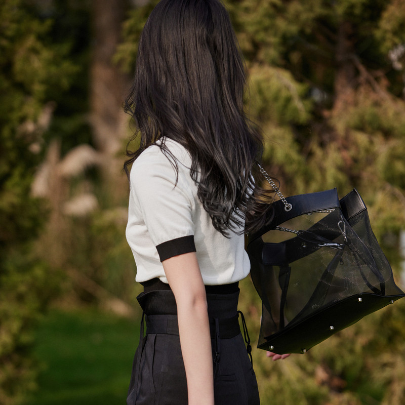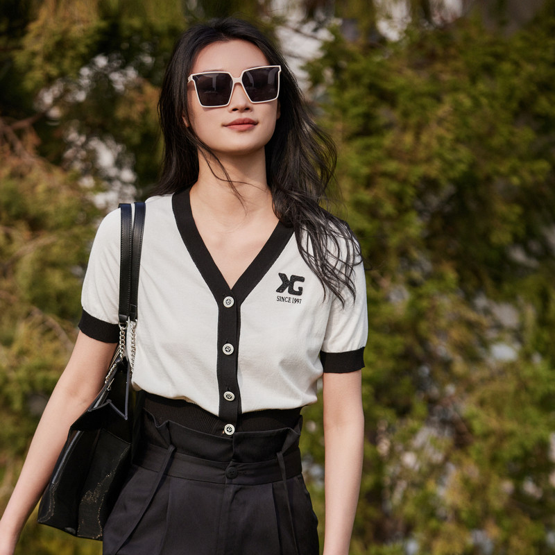 上衣XK211006A551 短袖 XG雪歌通勤简约撞色V领针织开衫 女25夏新款