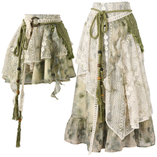 森女部落不规则设计感裙子森系波西米亚风印花拼接绿色半身裙女夏