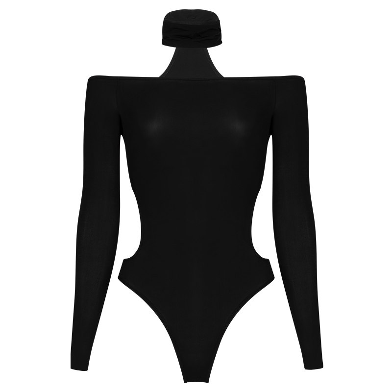 涞觅「猎手」一字肩连体衣女黑色纯欲丝滑性感镂空抹胸露肩紧身衣