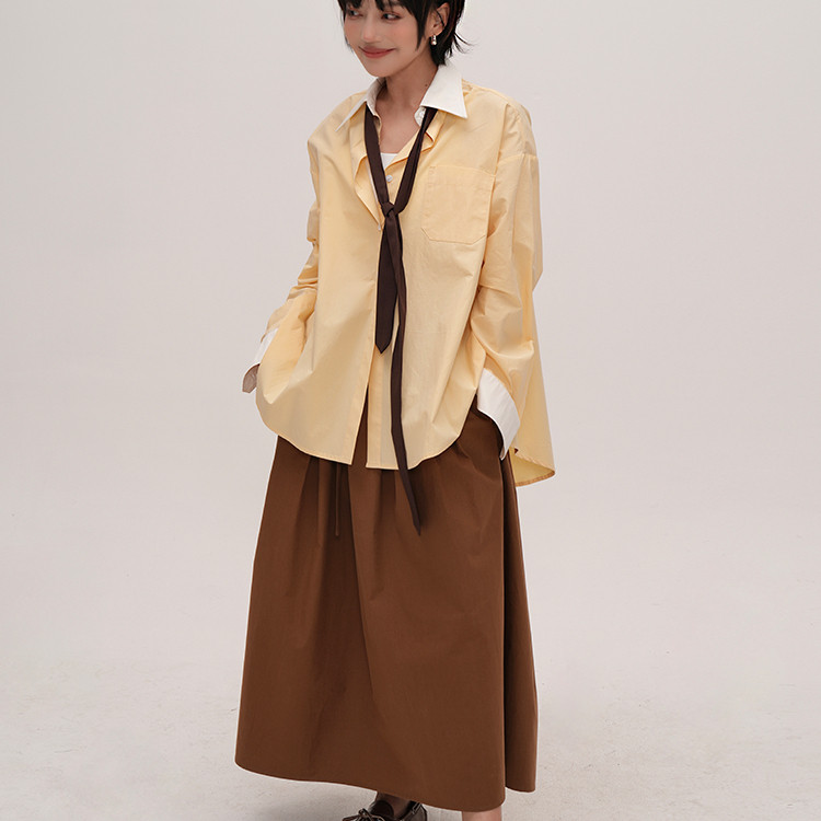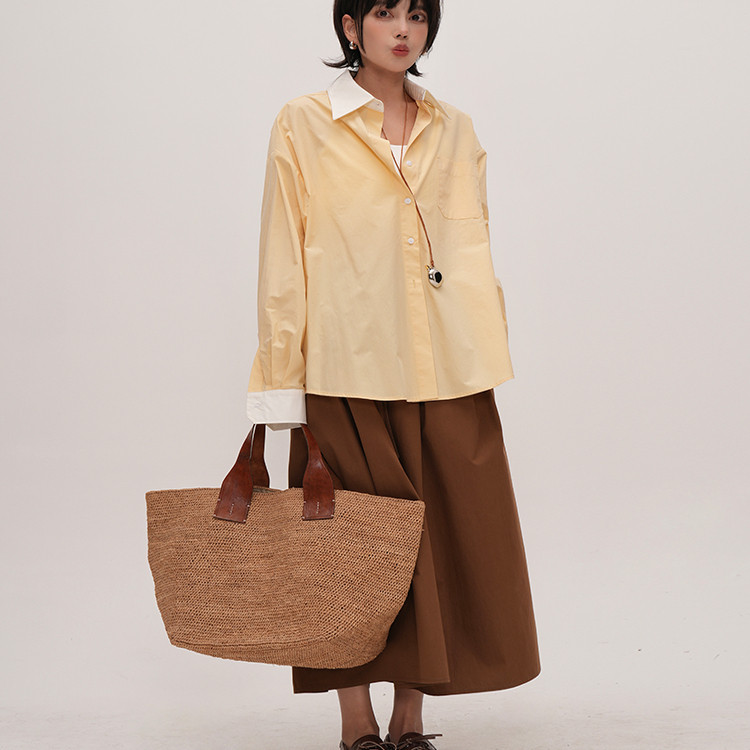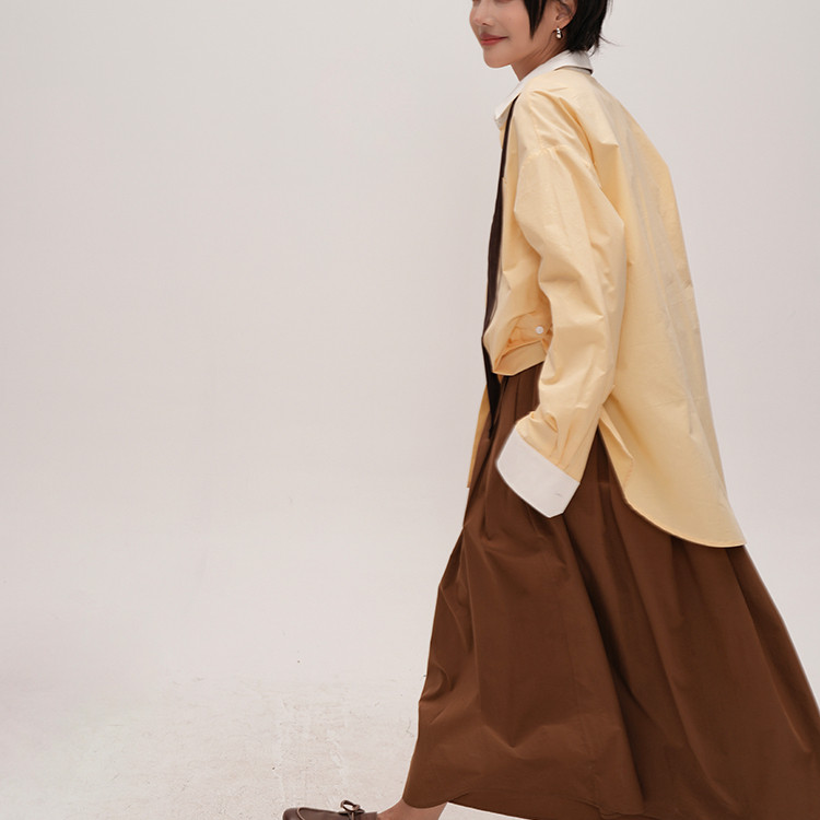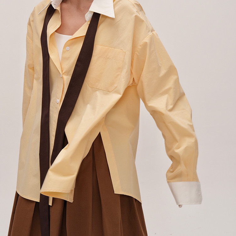 衬衫 谭烟米 拼色侧开衩长袖 淡淡奶昔黄 小众设计黄色衬衫