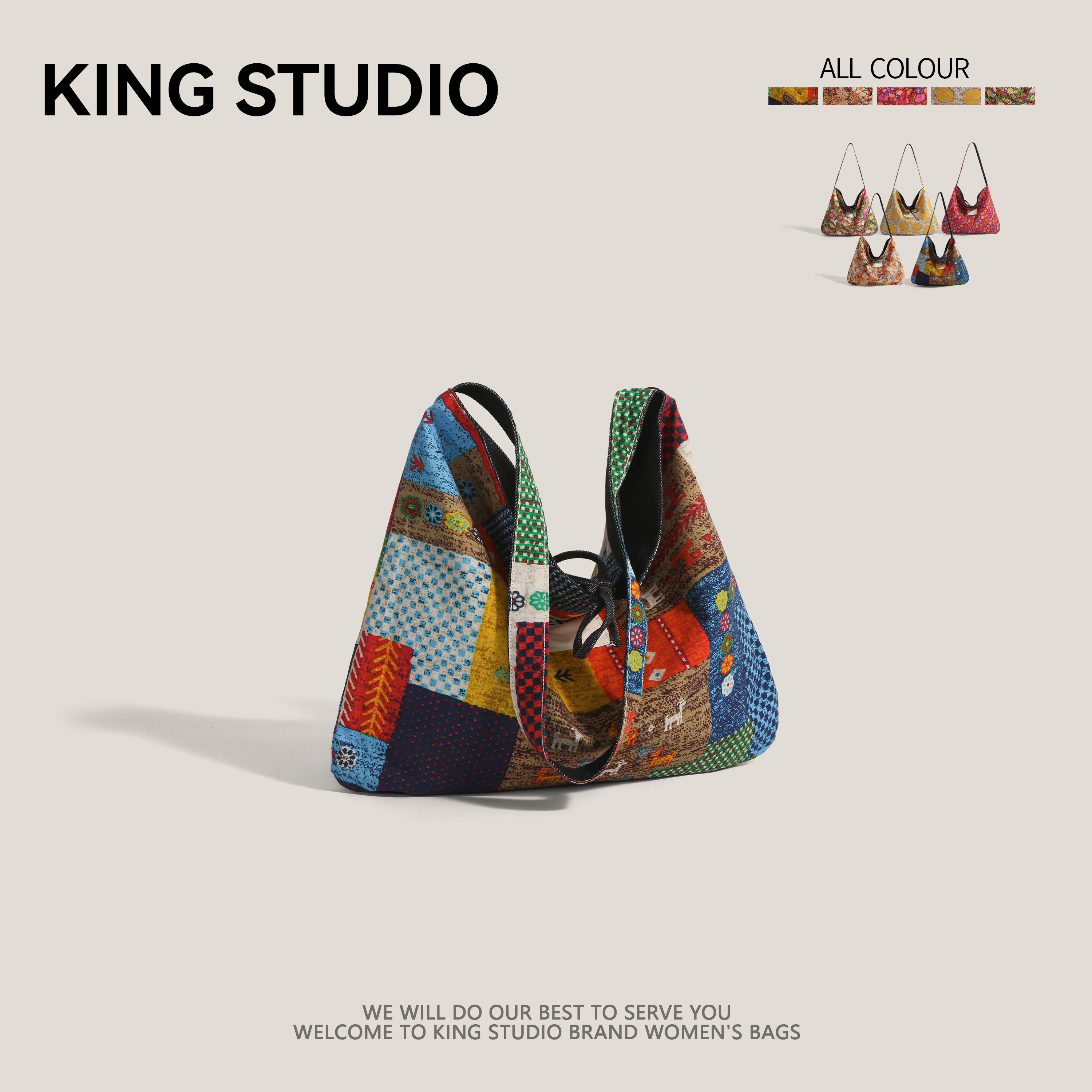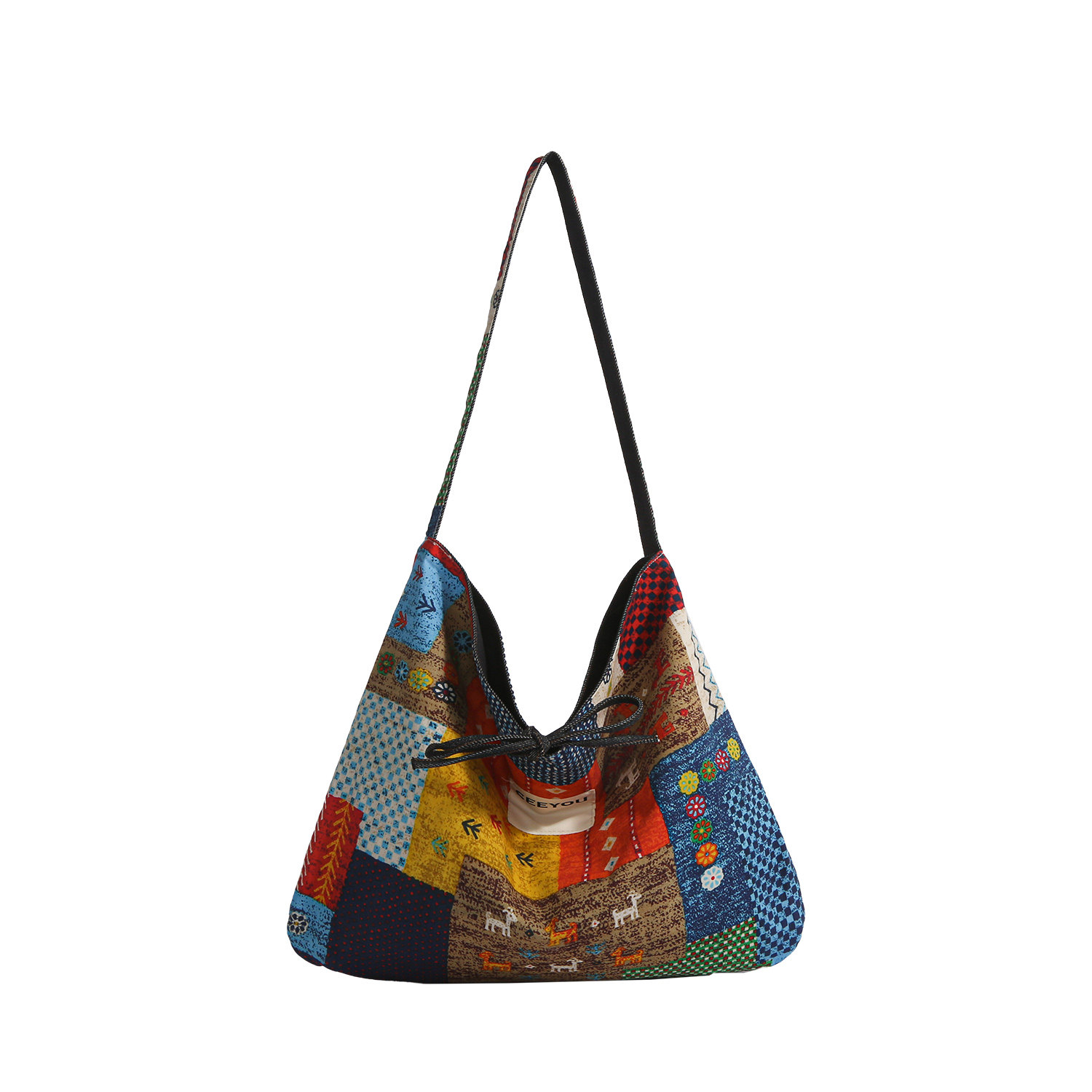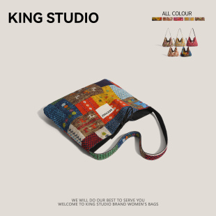 2026春夏新款 复古民族风拼贴撞色双面牛仔布包女单肩斜挎包帆布包