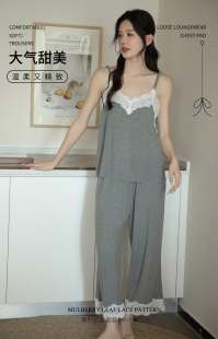 带胸垫 长裤 春夏螺纹莫代尔柔软蕾丝花边吊带睡衣女家居服套装 短裤