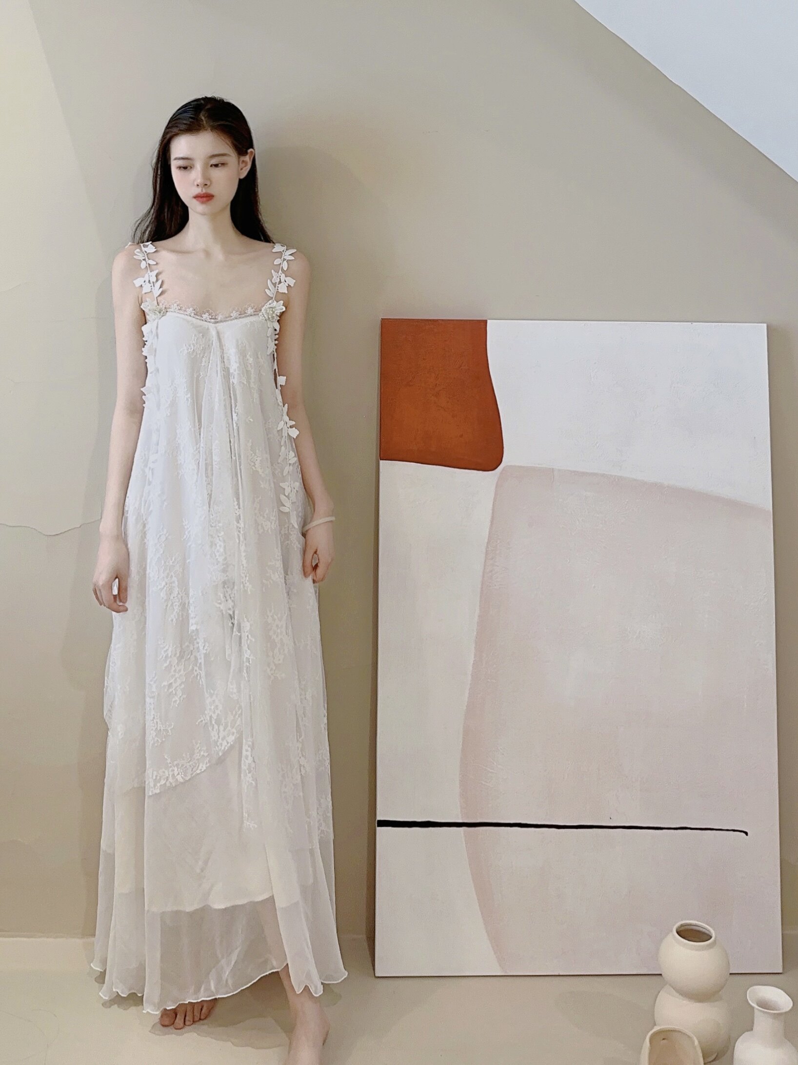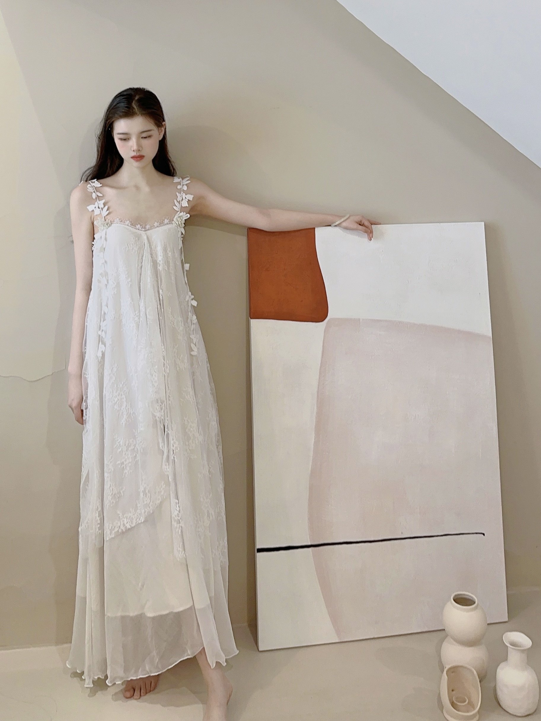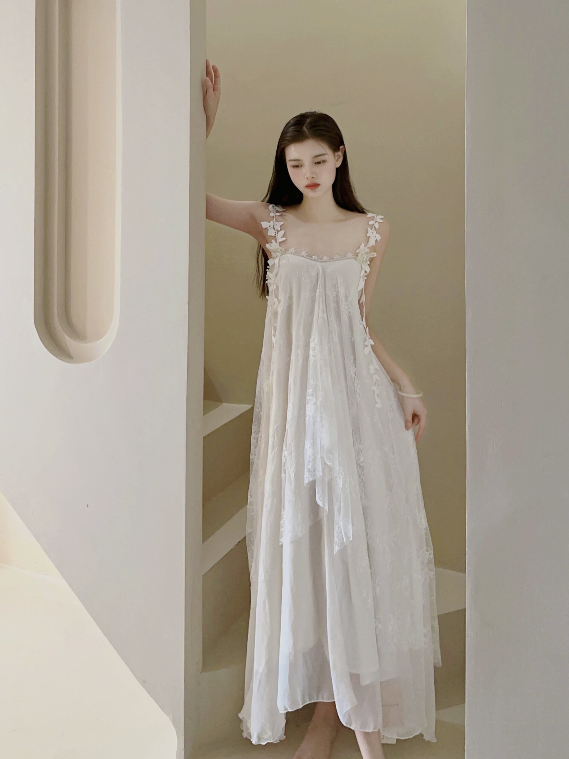 未闻花名白色珍珠蝴蝶蕾丝仙女网纱长款 吊带连衣裙