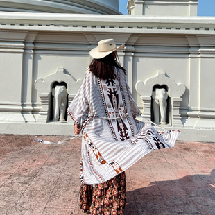 波西米亚开衫 度假风几何印花带腰带沙滩连衣裙民族风防晒人棉外套