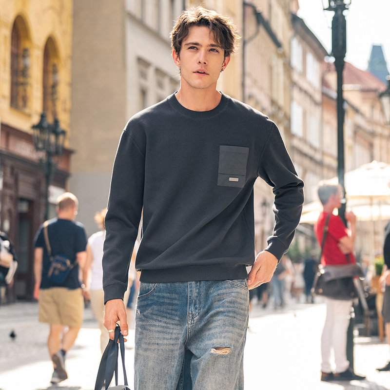 t恤上衣断码 梭织口袋时尚 秋冬长袖 MrBu布先生圆领套头卫衣男款