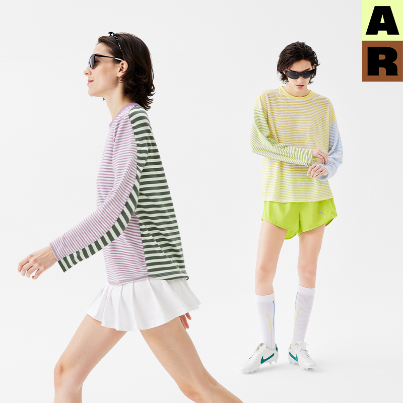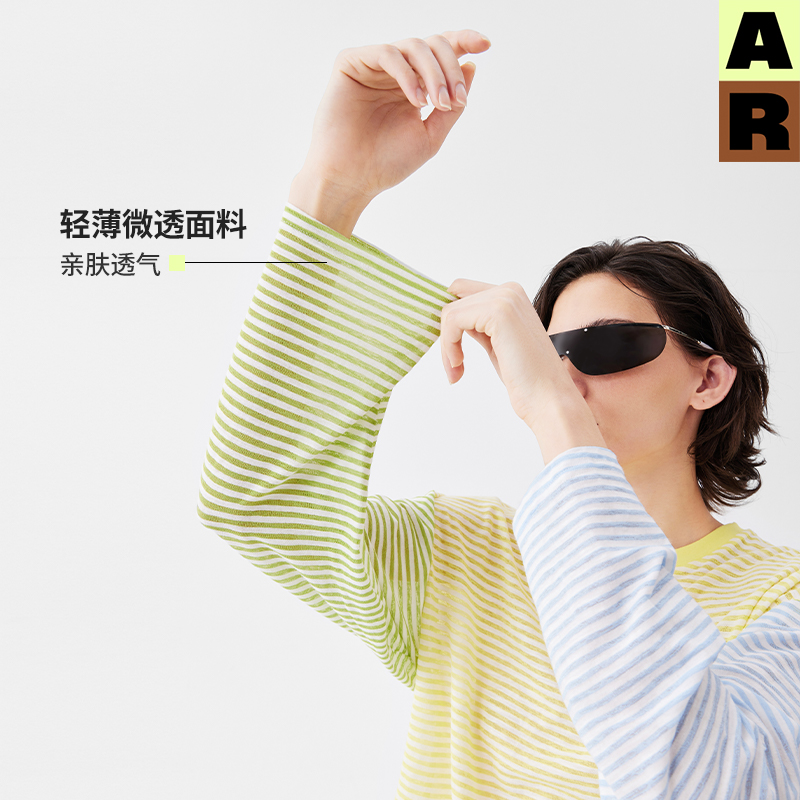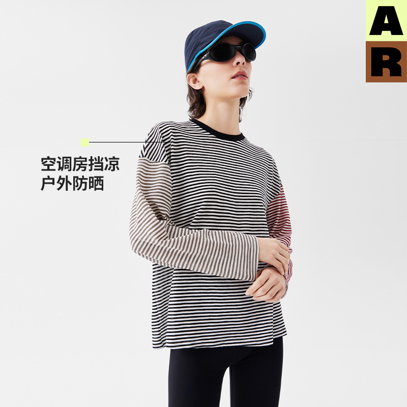 AR条纹撞色长袖 清凉巨好看宽松上衣女 运动T恤轻薄透气防晒罩衫