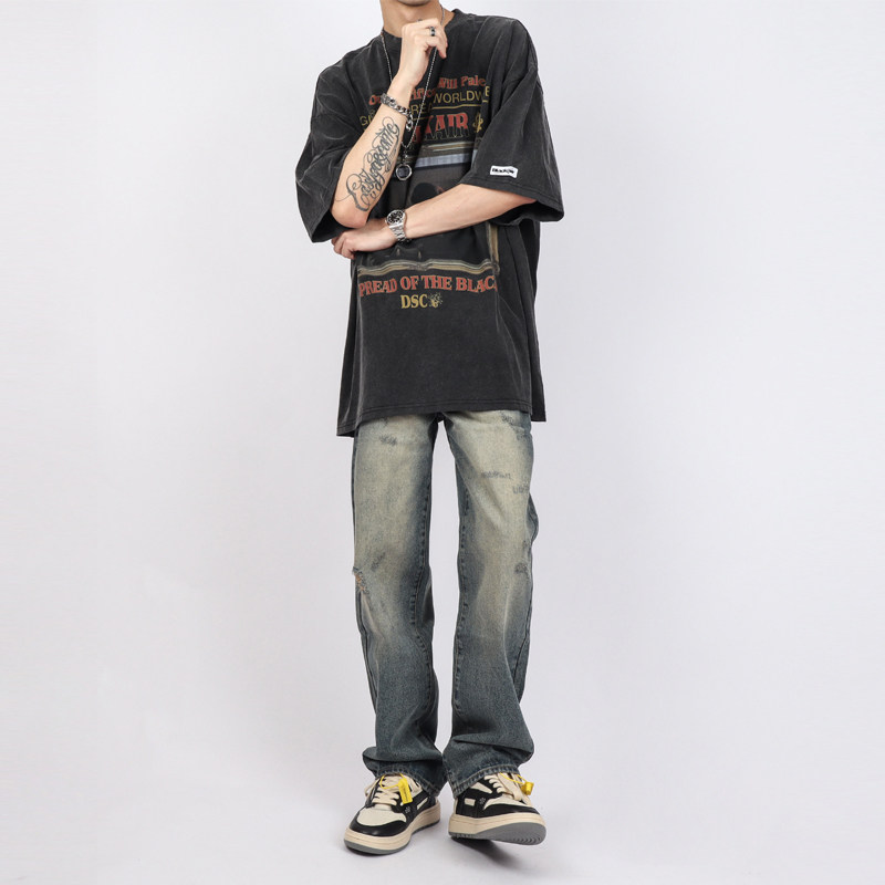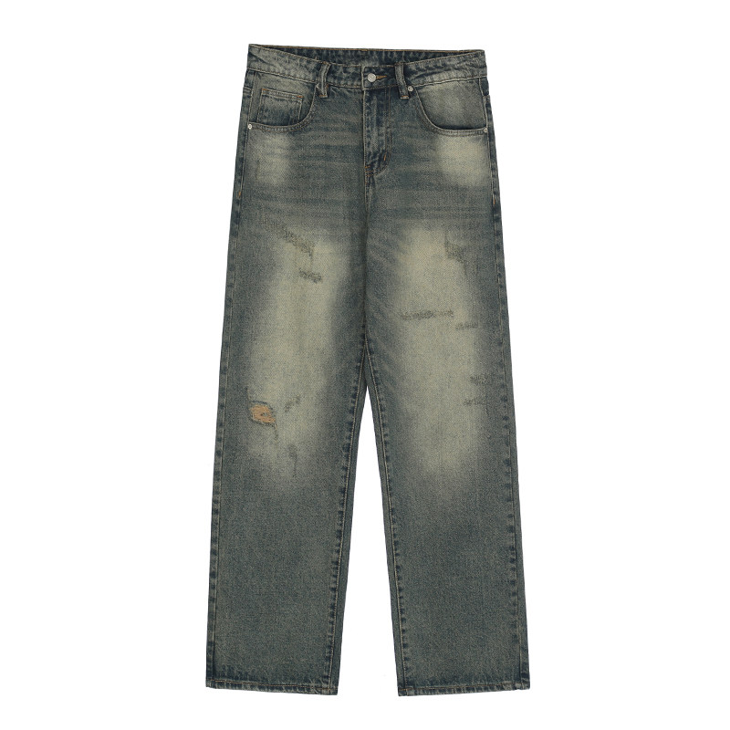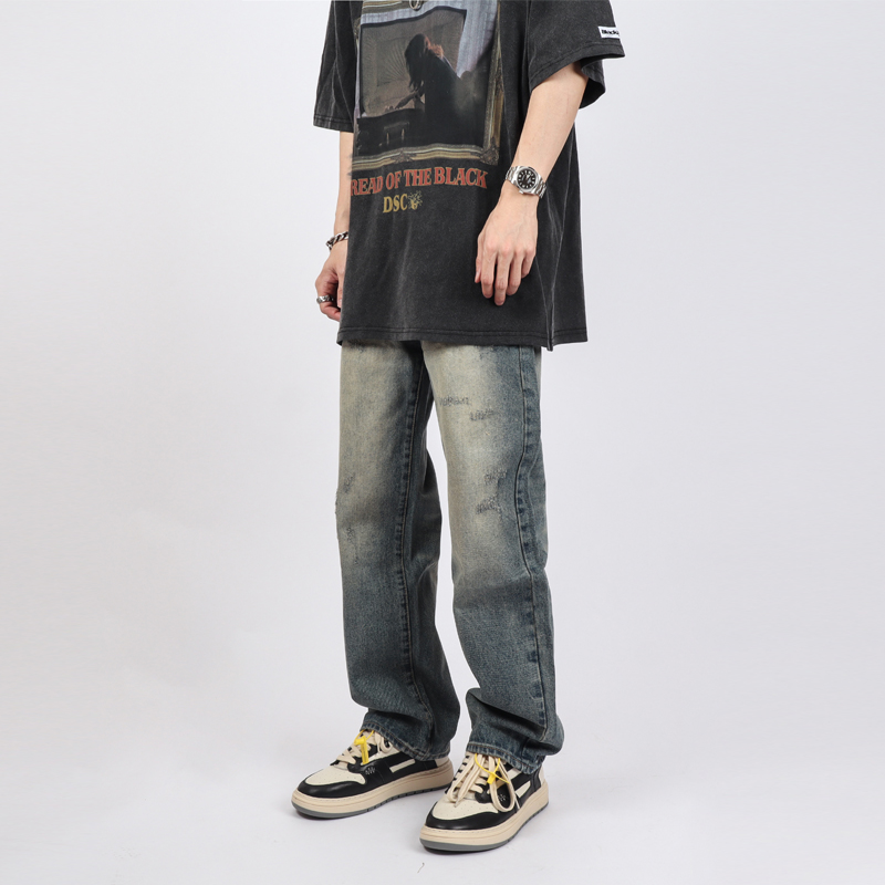 直筒宽松裤 男款 复古休闲破洞牛仔裤 子潮牌女秋冬 POCKET高街美式