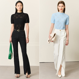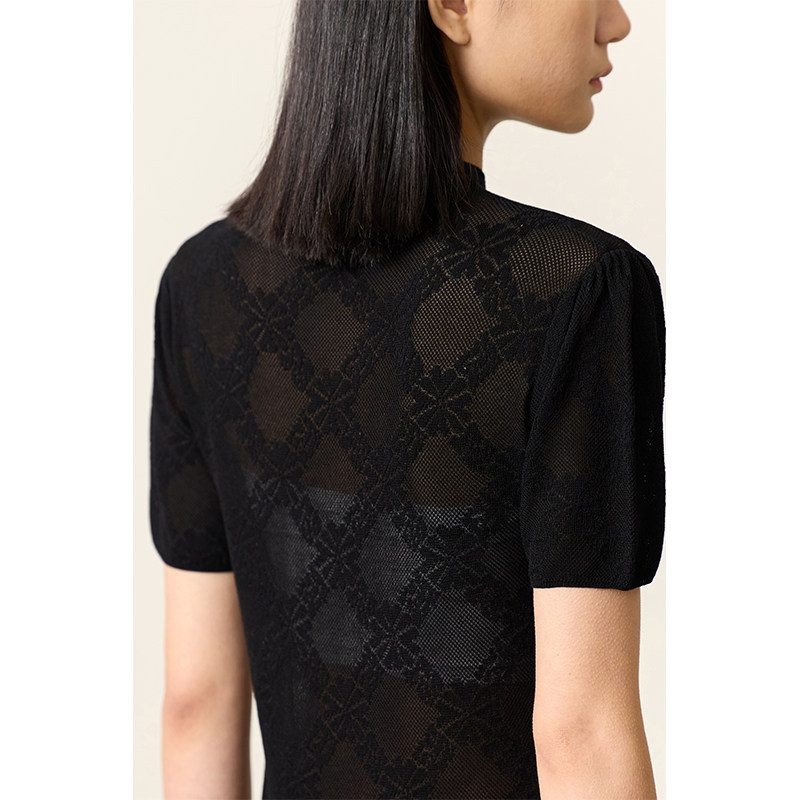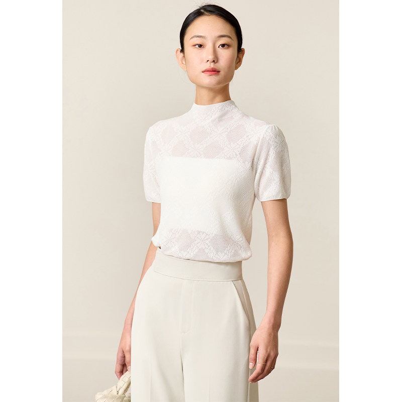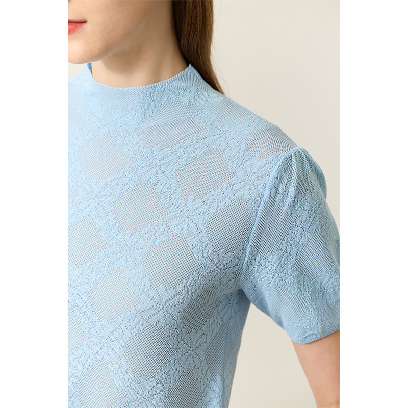 女上衣 显瘦毛针织衫 Amii2026夏新半高领花卉菱格提花碎褶短袖 修身