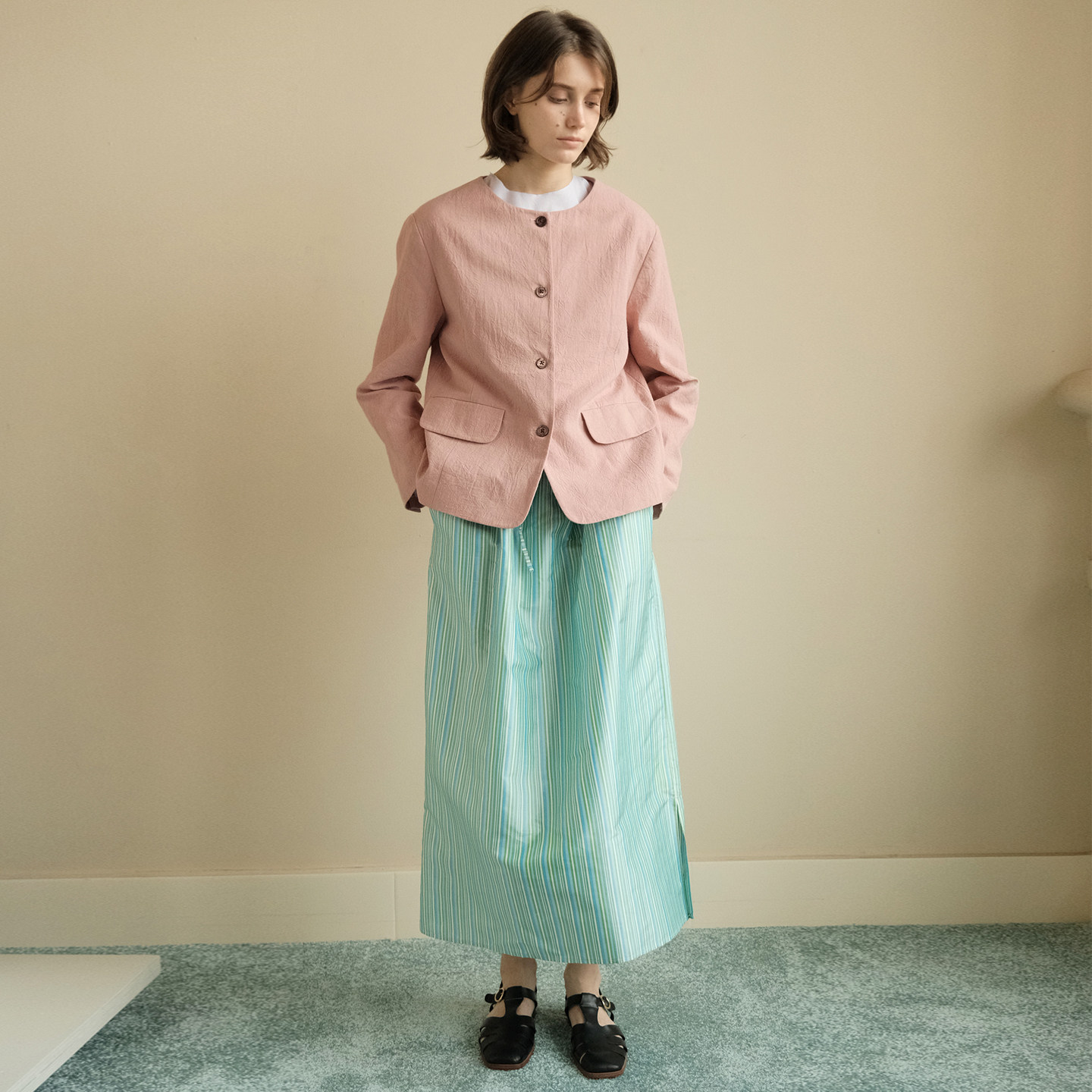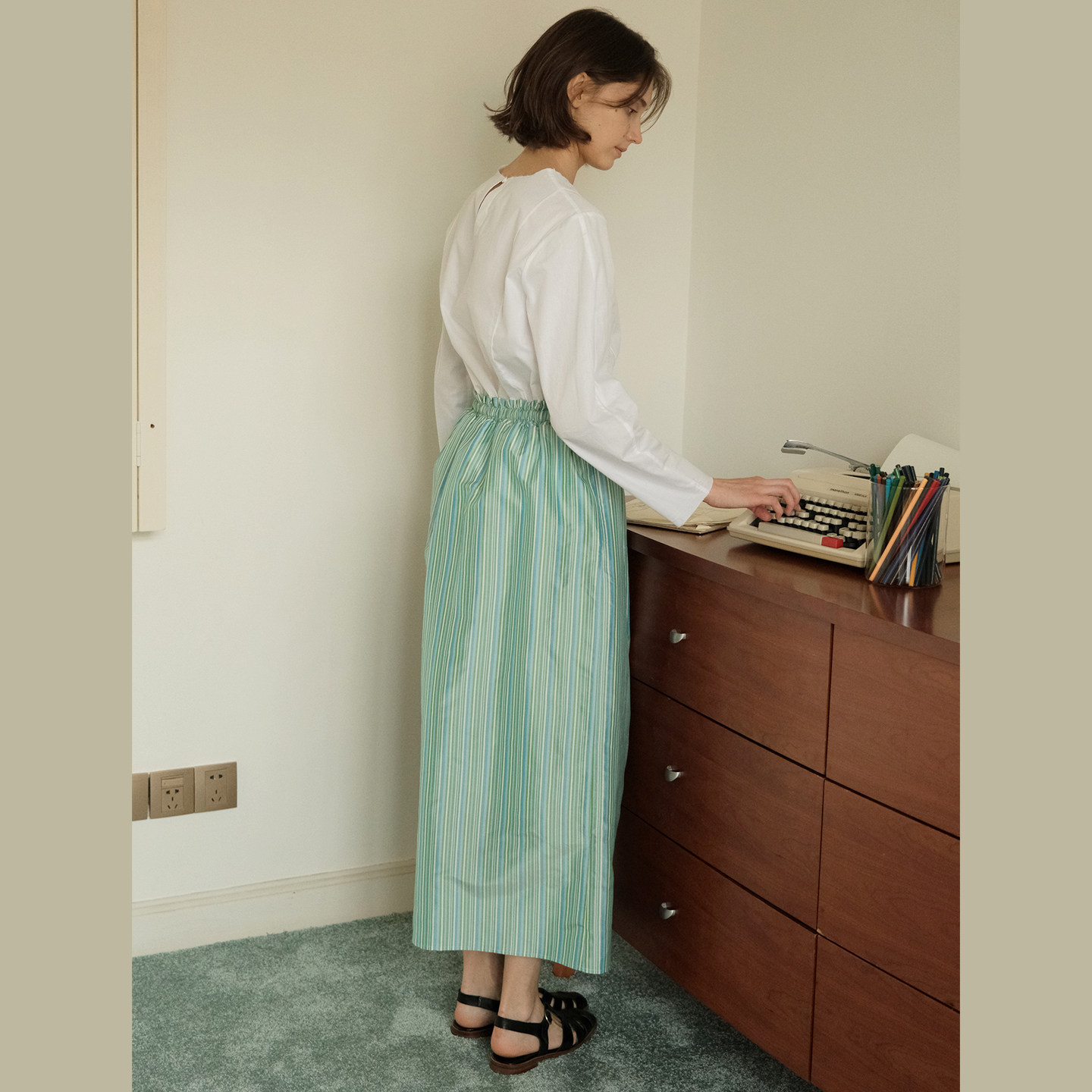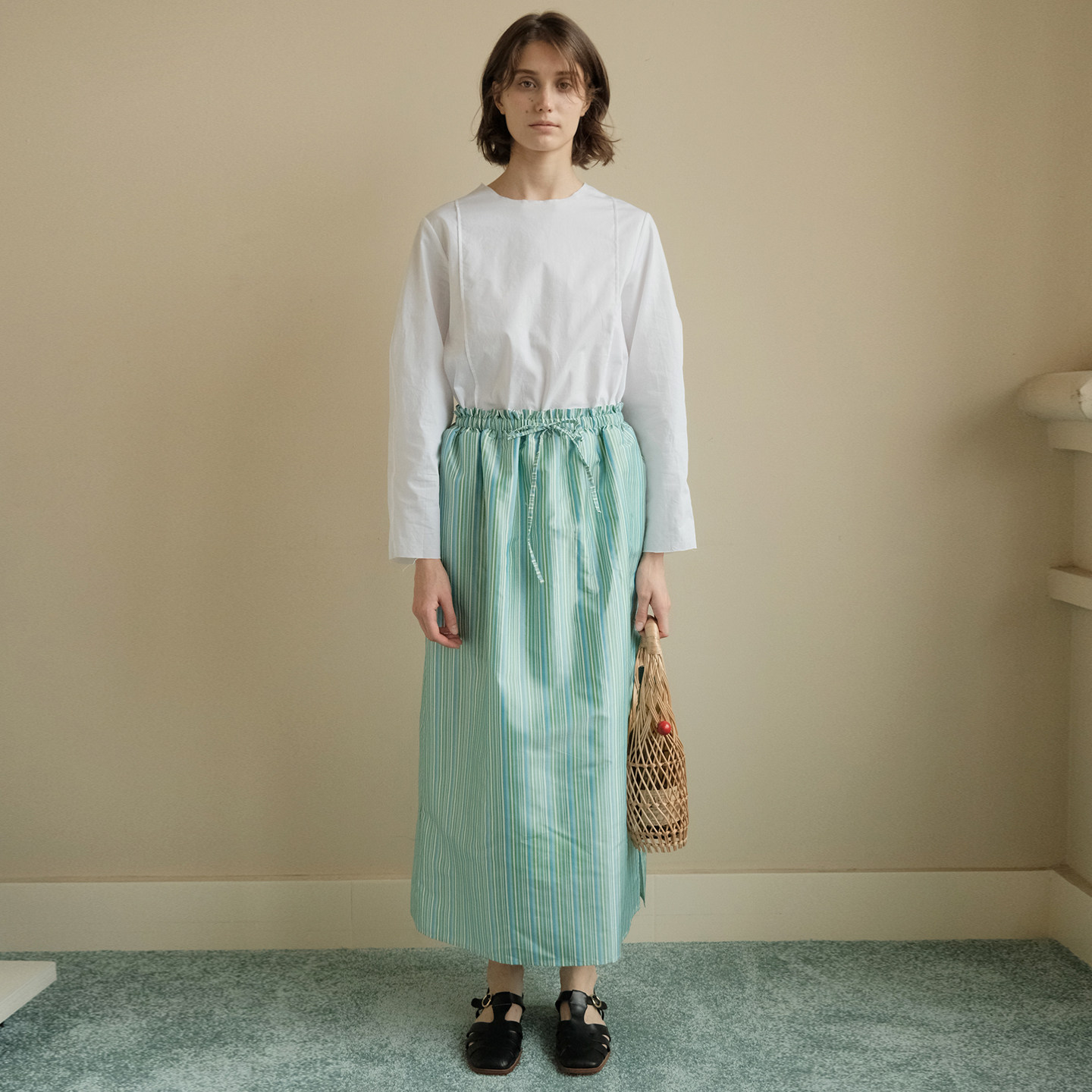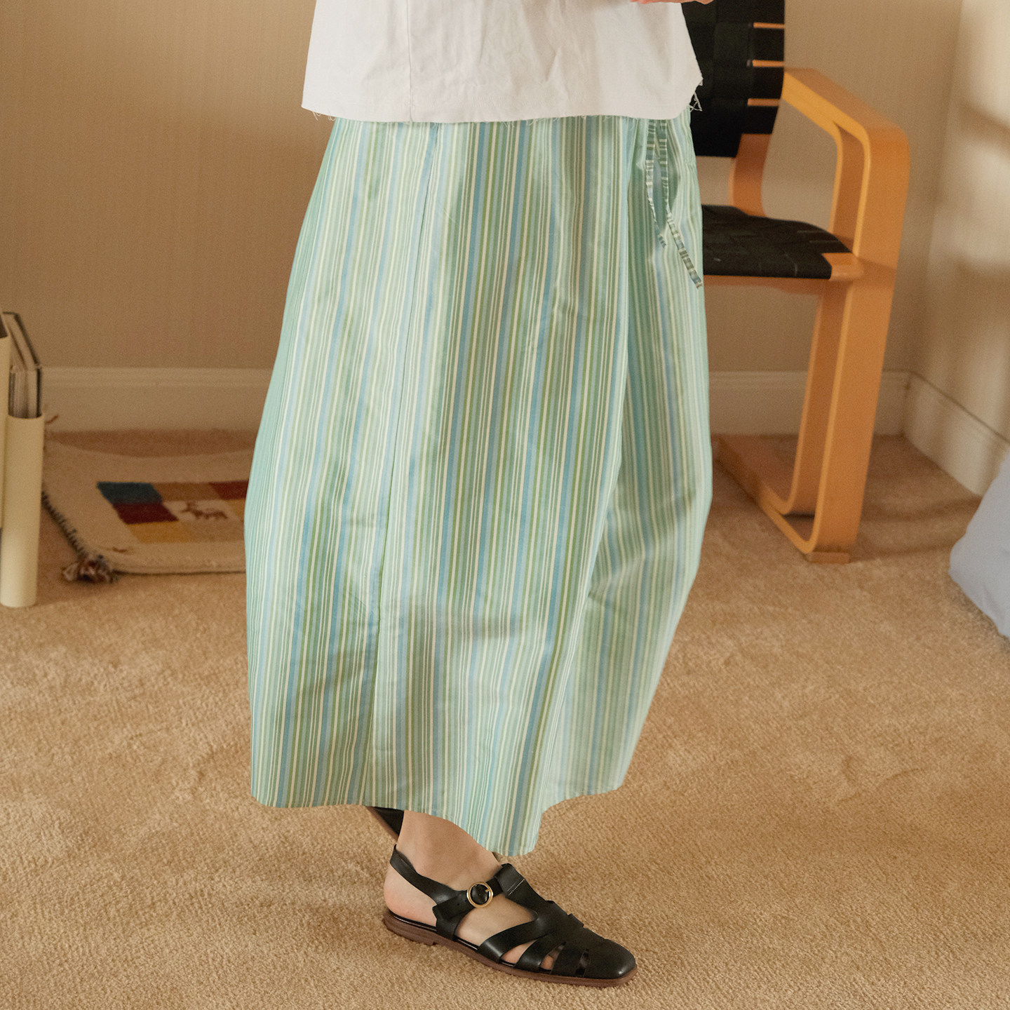 极美真丝双宫薄荷条纹 限量 轻盈松紧腰长裙 lab 慢呢mannee