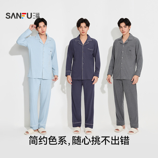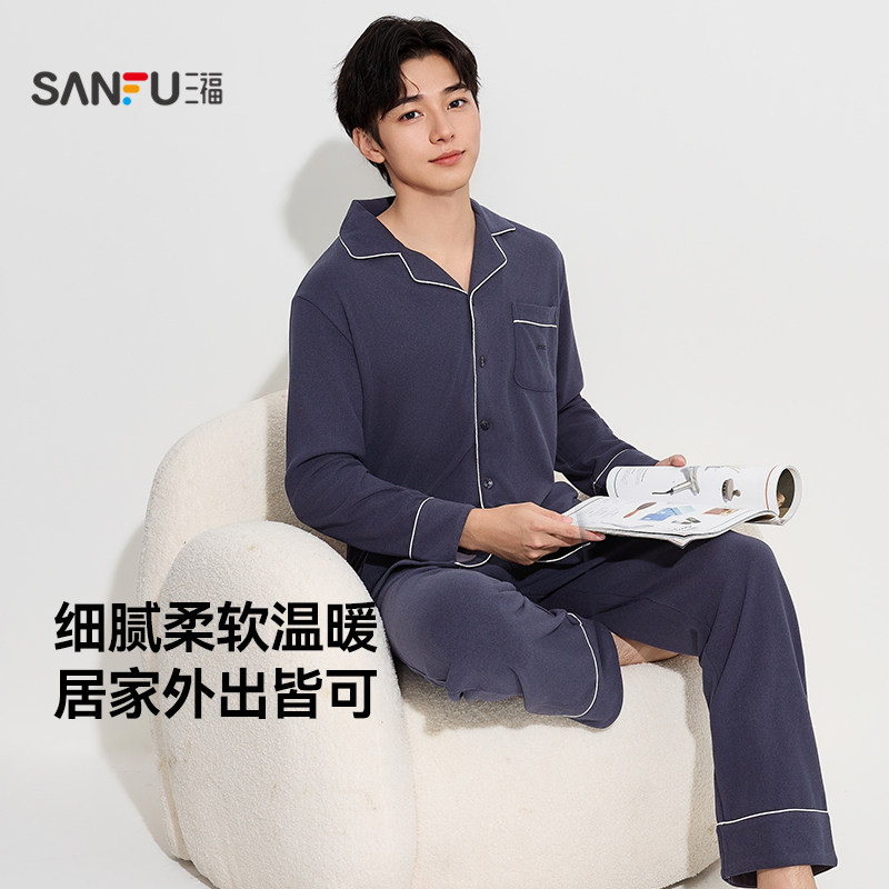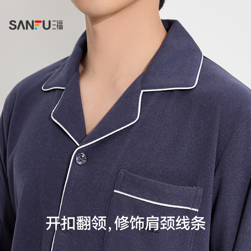 柔软撞色边宽松长袖 基础翻领睡衣套装 家居服507403 三福男冬季