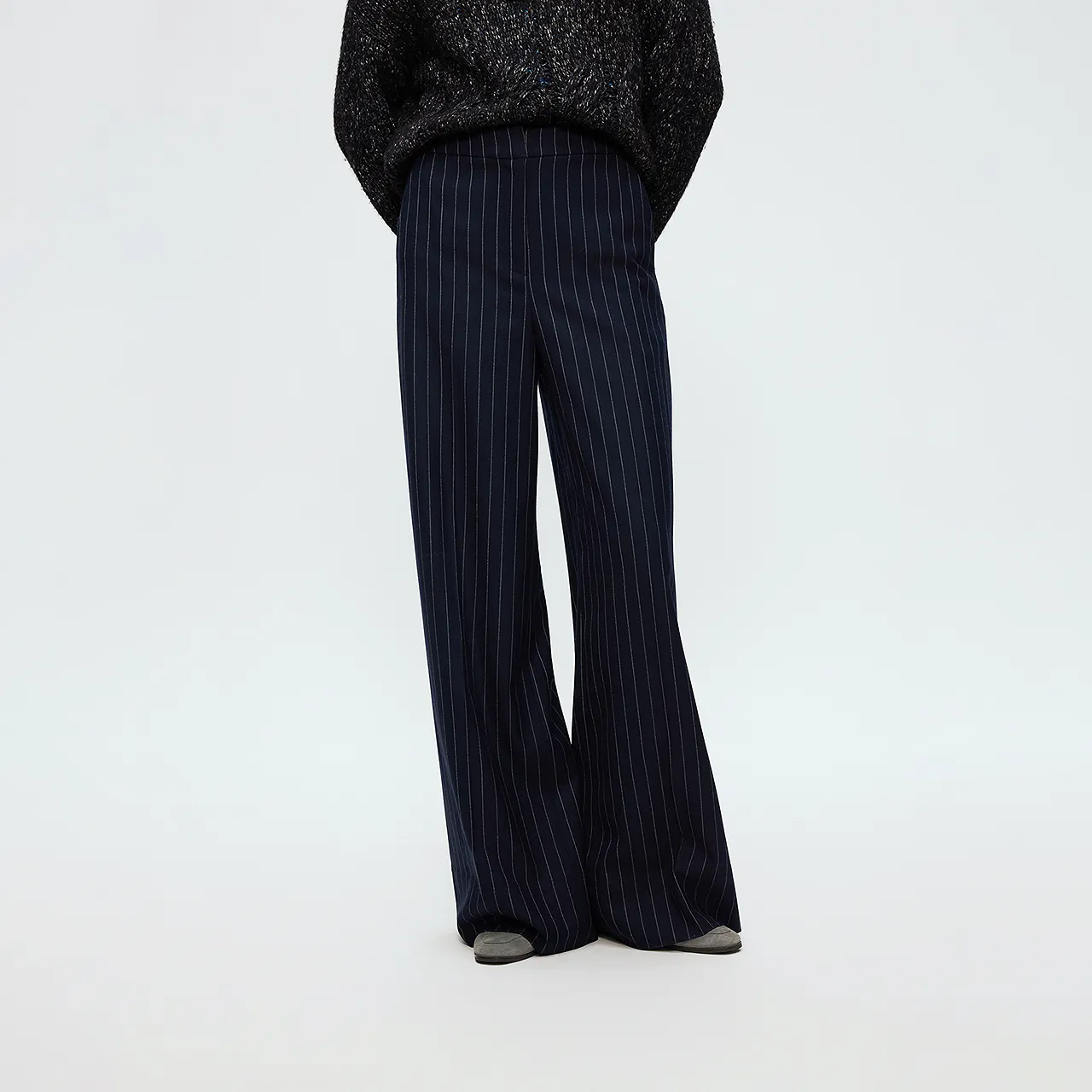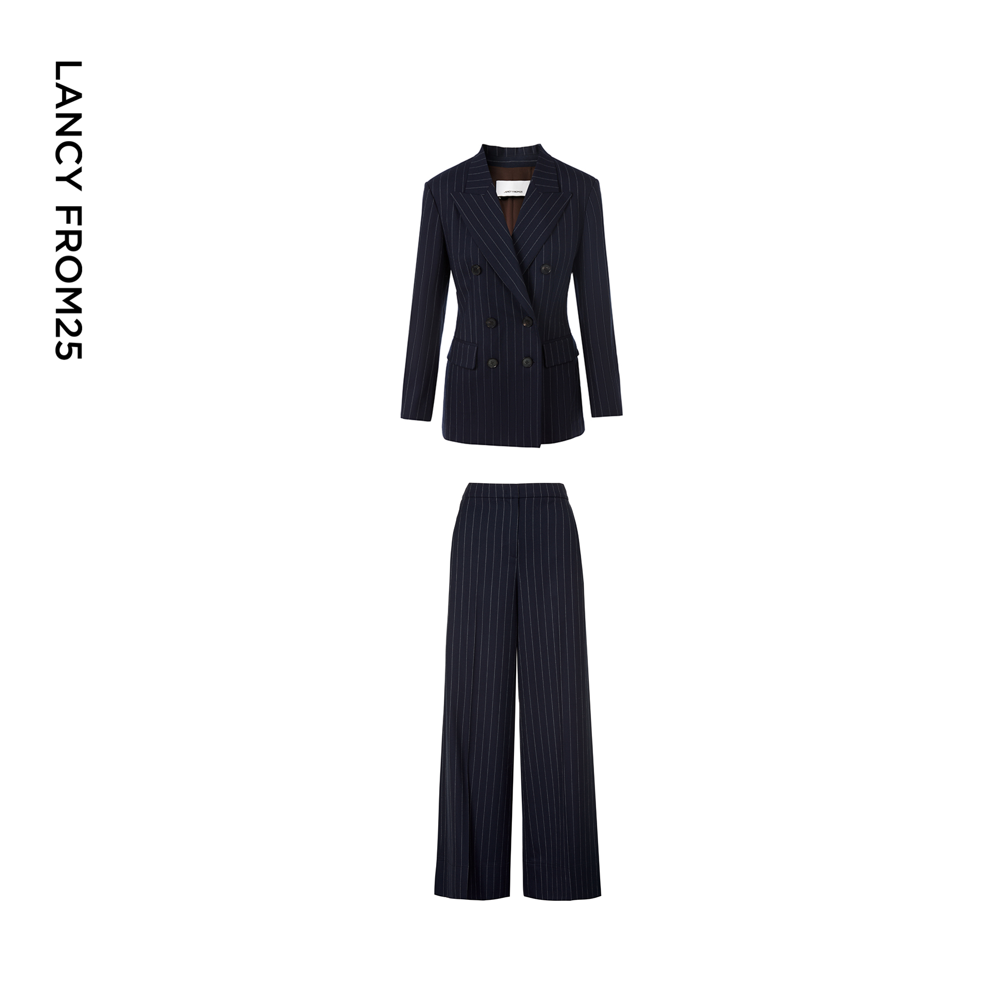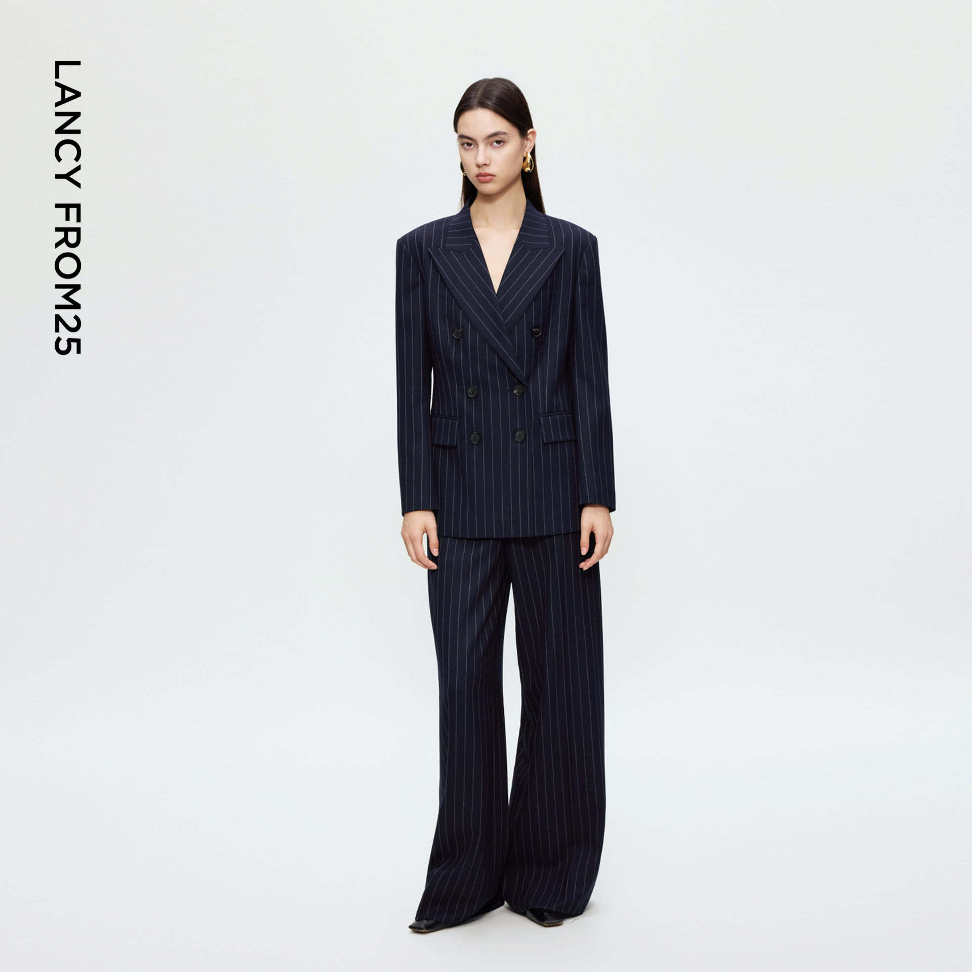 朗姿羊毛戗驳领条纹直筒西装 王楚然同款 老钱风女 秀场同款