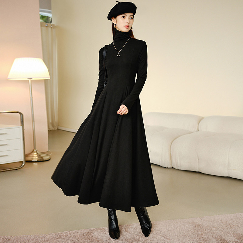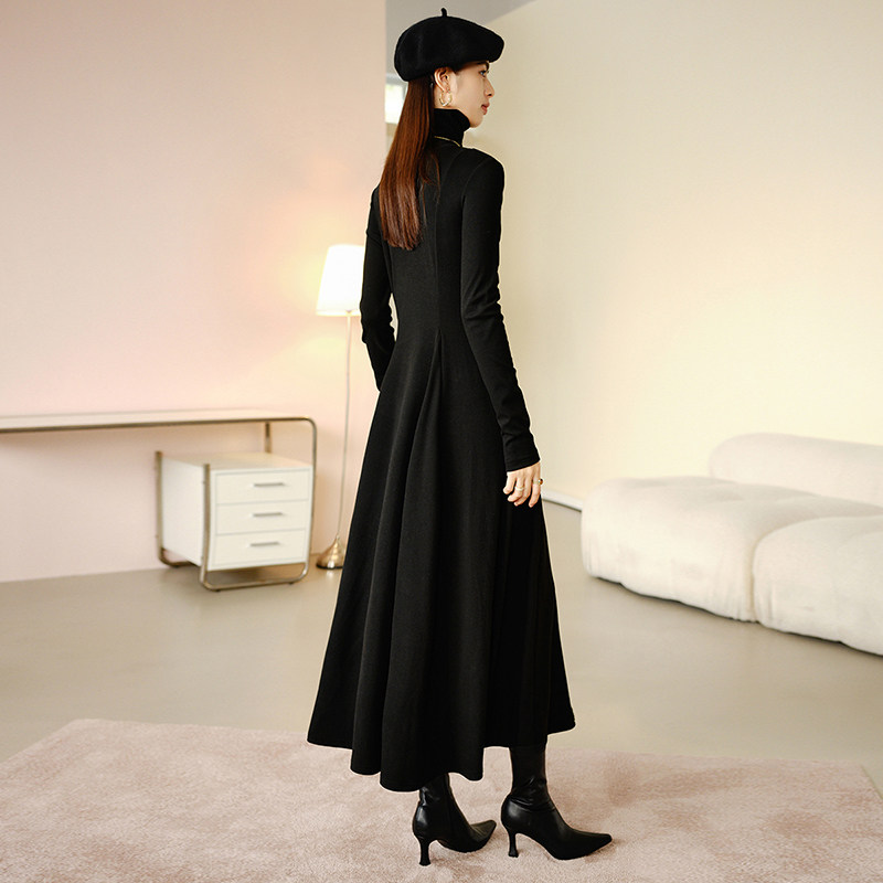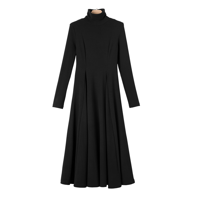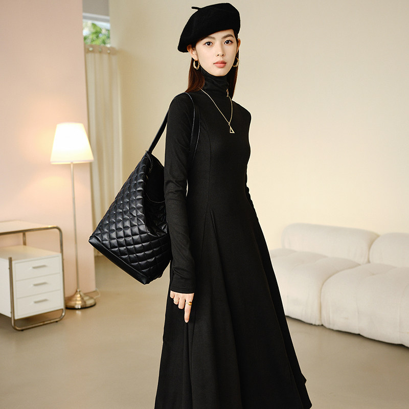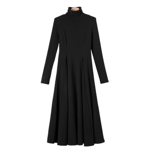 晚白2025年秋冬新款 韩系气质打底裙子休闲高领拼接黑色收腰连衣裙