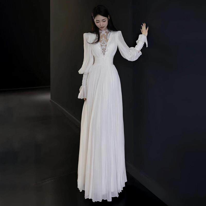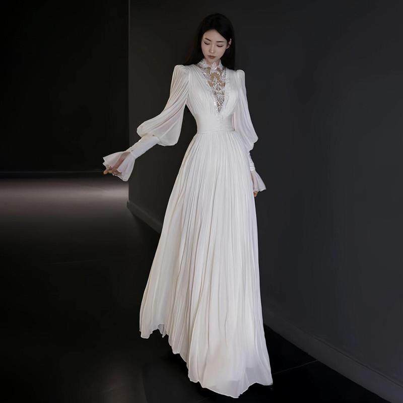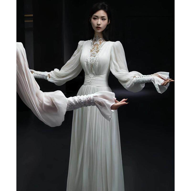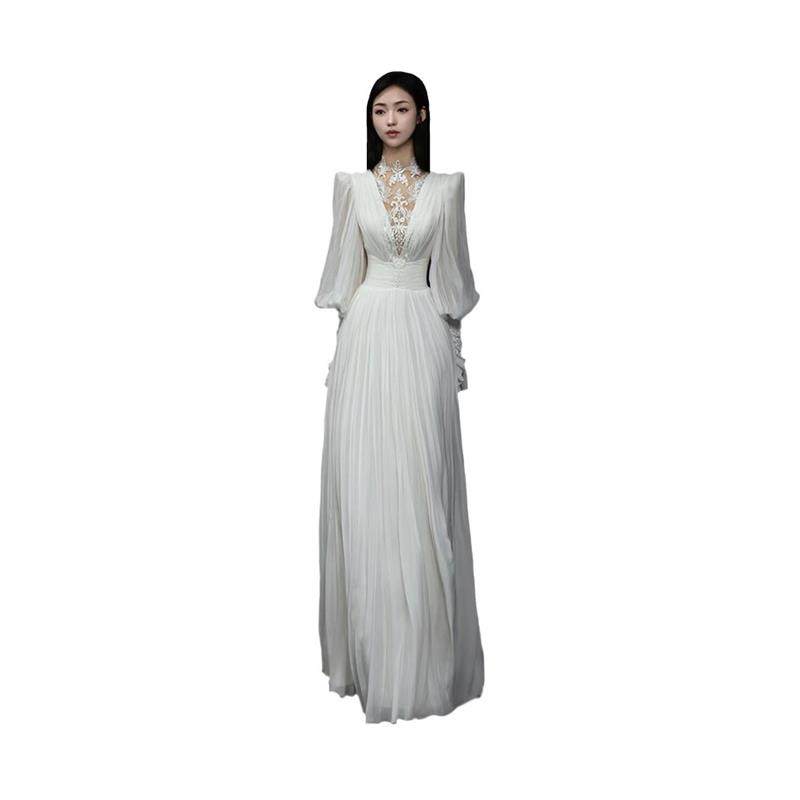 高货蕾丝长袖 新娘高级感复古订婚出门纱缎面优雅晨袍礼 轻婚纱法式