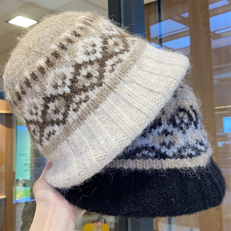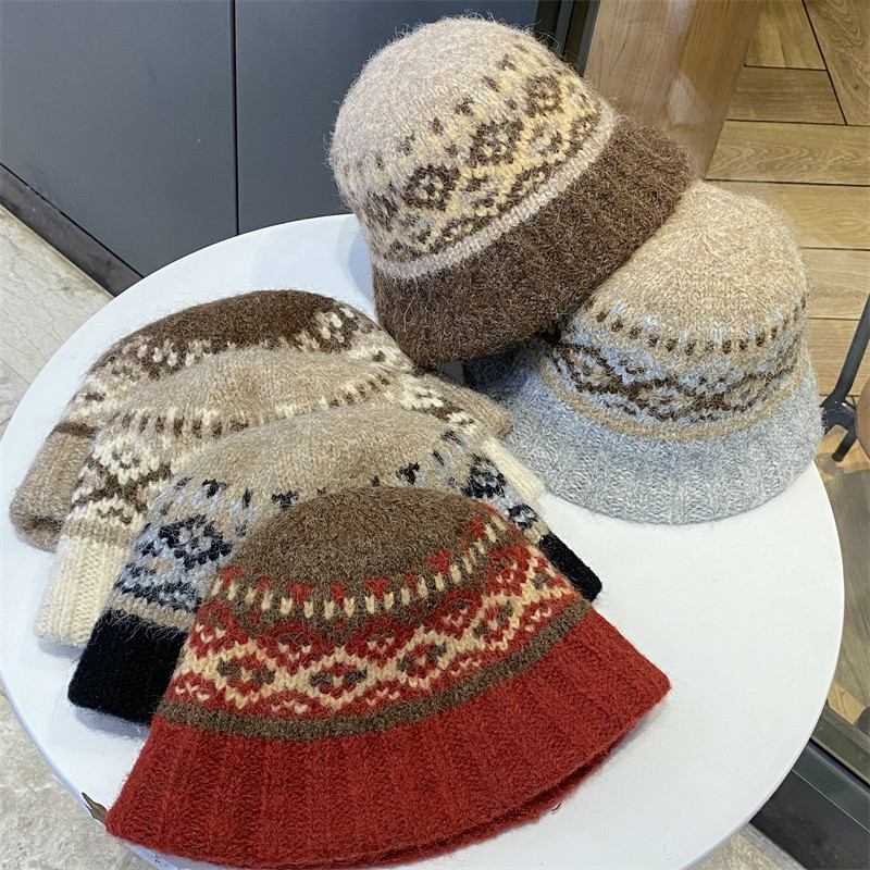 民族风费尔岛风提花针织帽女秋冬季 保暖护耳百搭显脸小毛线帽 新款