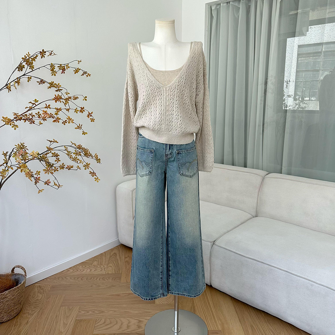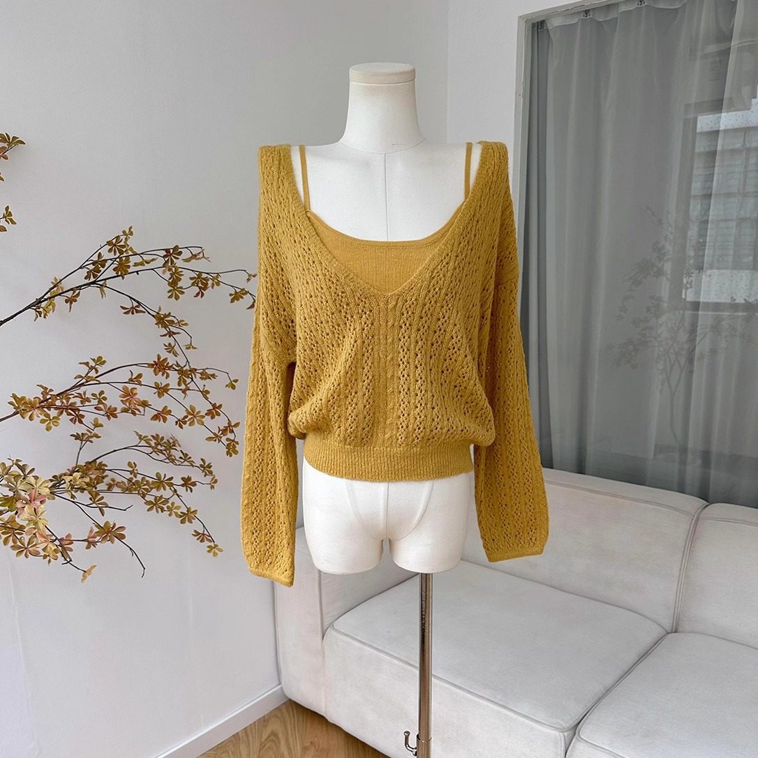 柒月末首尔假期v领长毛马海镂空上衣女秋绞花针织罩衫 吊带两件套