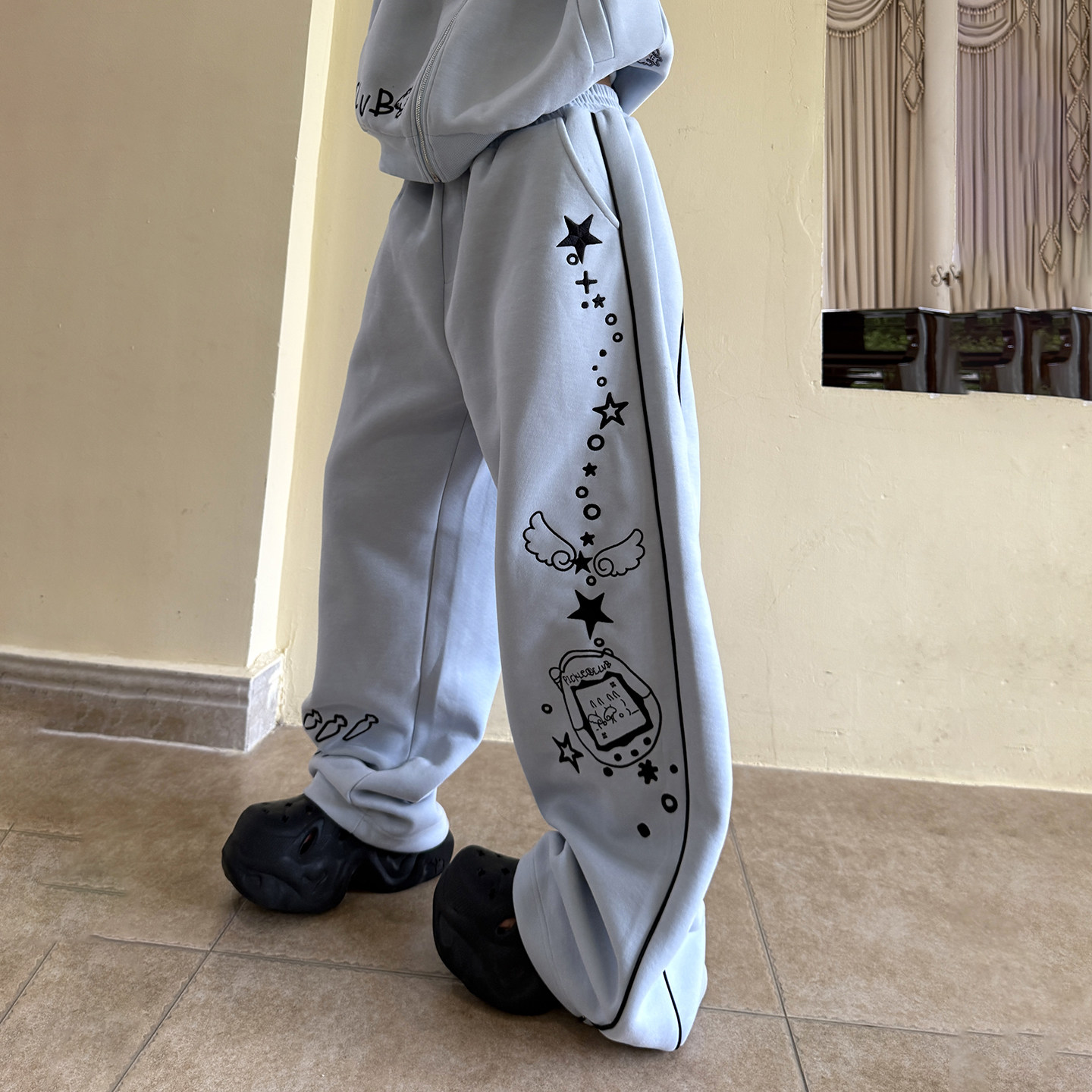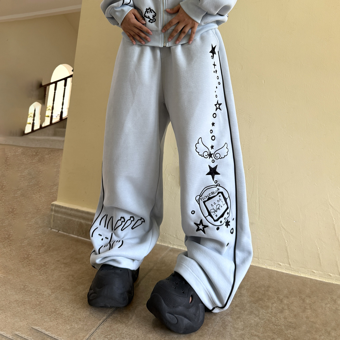 休闲百搭开衫 连帽卫衣套装 外套 刺绣电子兔兔运动卫裤 梁拌泡菜美式