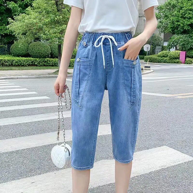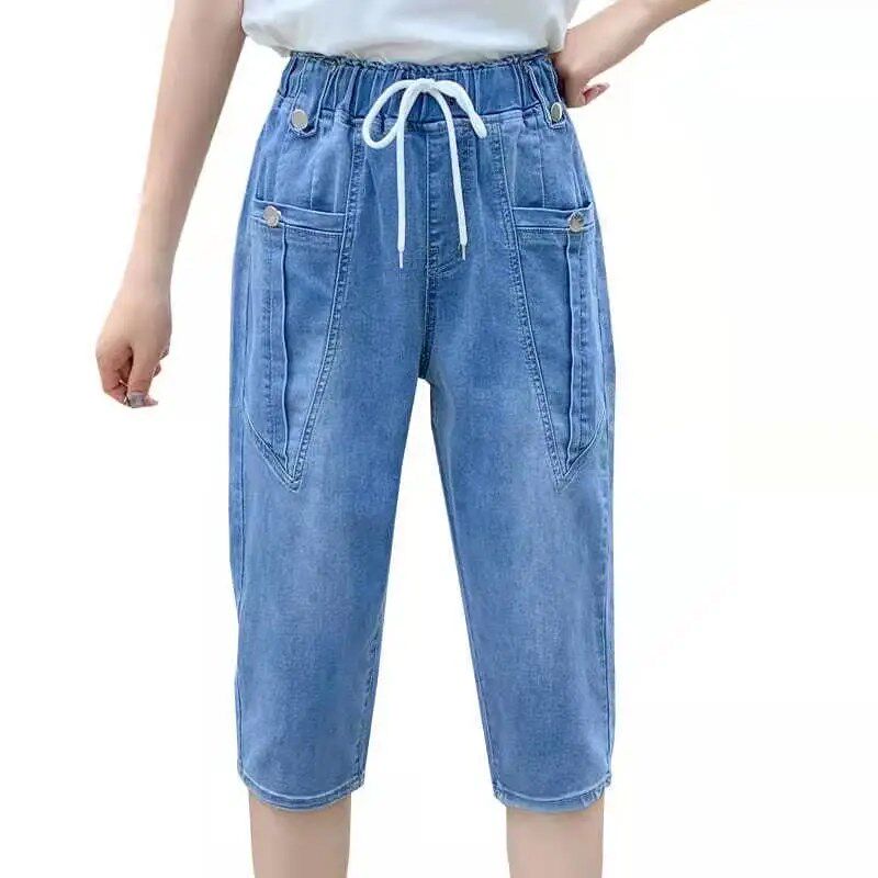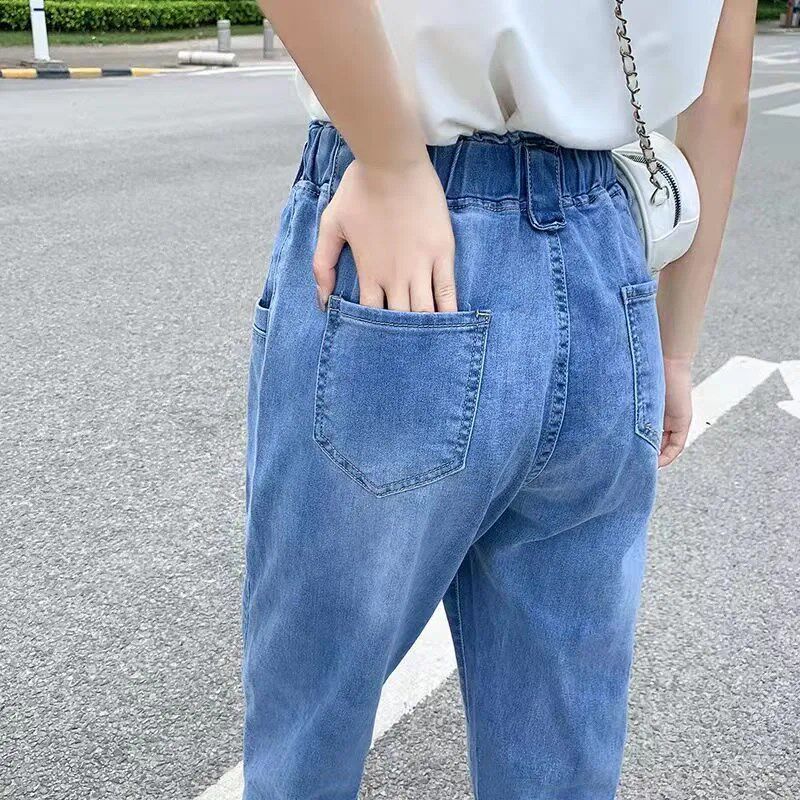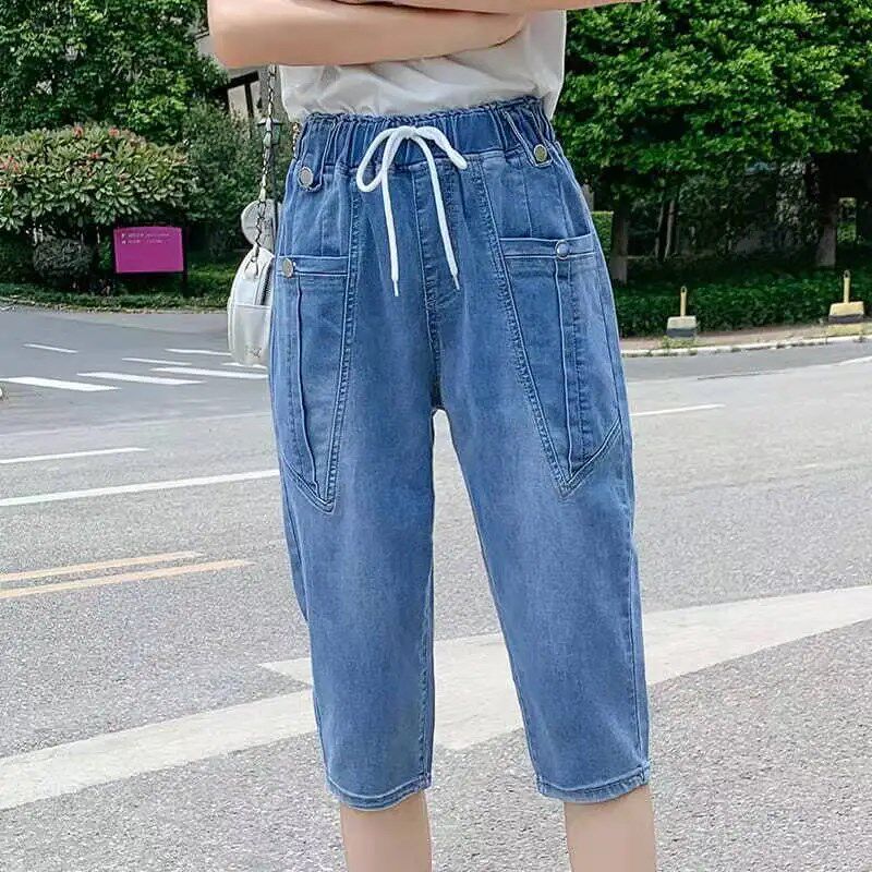 女2025夏季 松紧高腰7分萝卜裤 新款 宽松薄款 子 韩版 哈伦六分牛仔裤