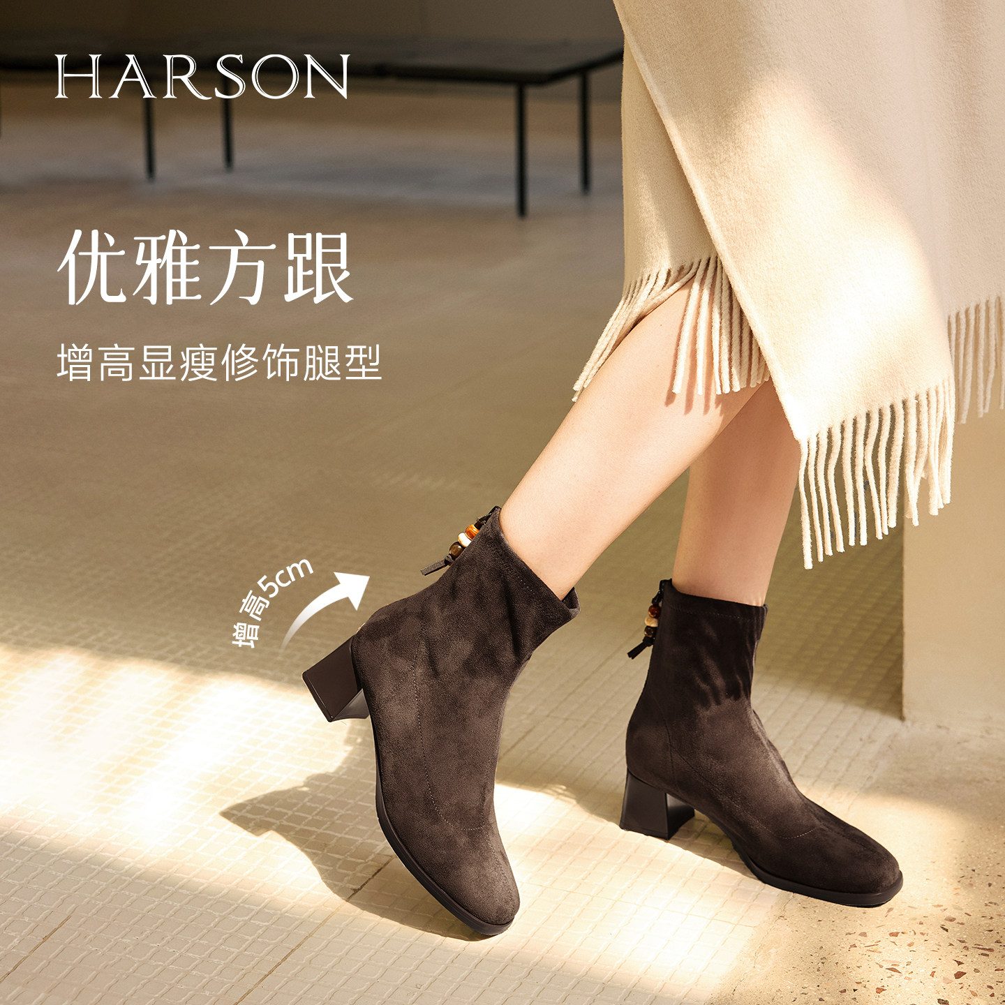 百丽画廊假日加绒时装 弹力靴反绒面粗高跟显瘦瘦短靴子BBWB1DZ5