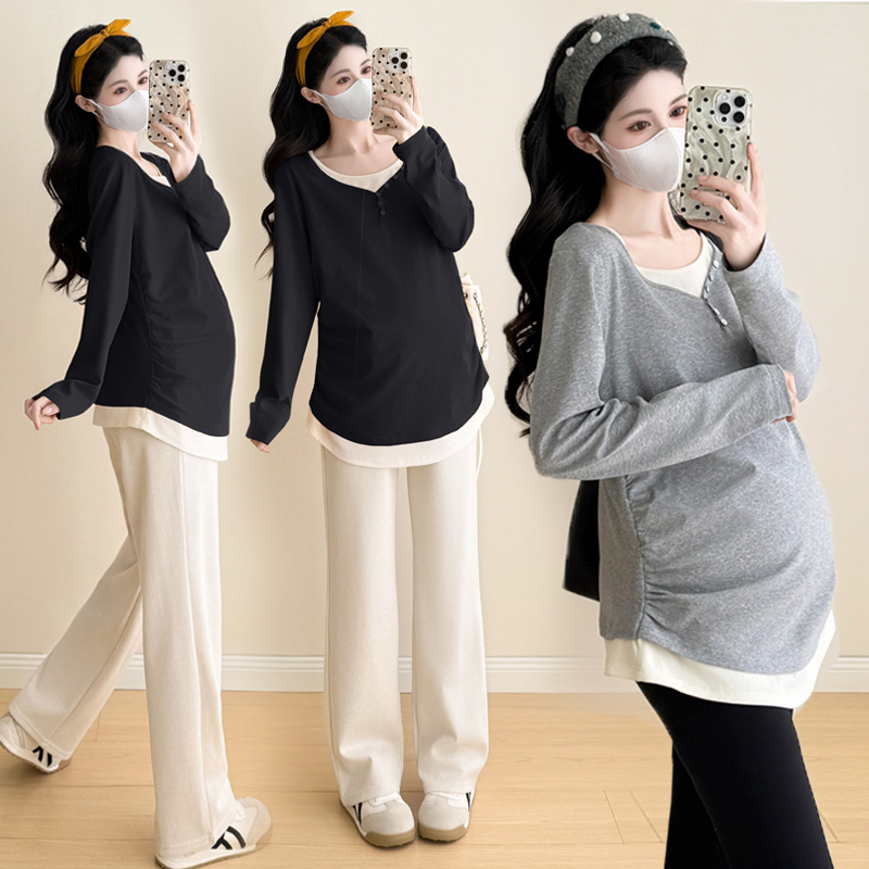 宽松显瘦百搭打底衫 春秋款 上衣 T恤女2025新款 婧麒孕妇假两件长袖
