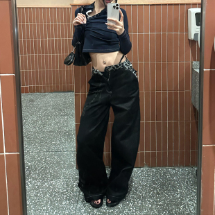 女设计感黑色宽松阔腿拖地长裤 复古豹纹拼接腰头牛仔裤 子 美式 大码