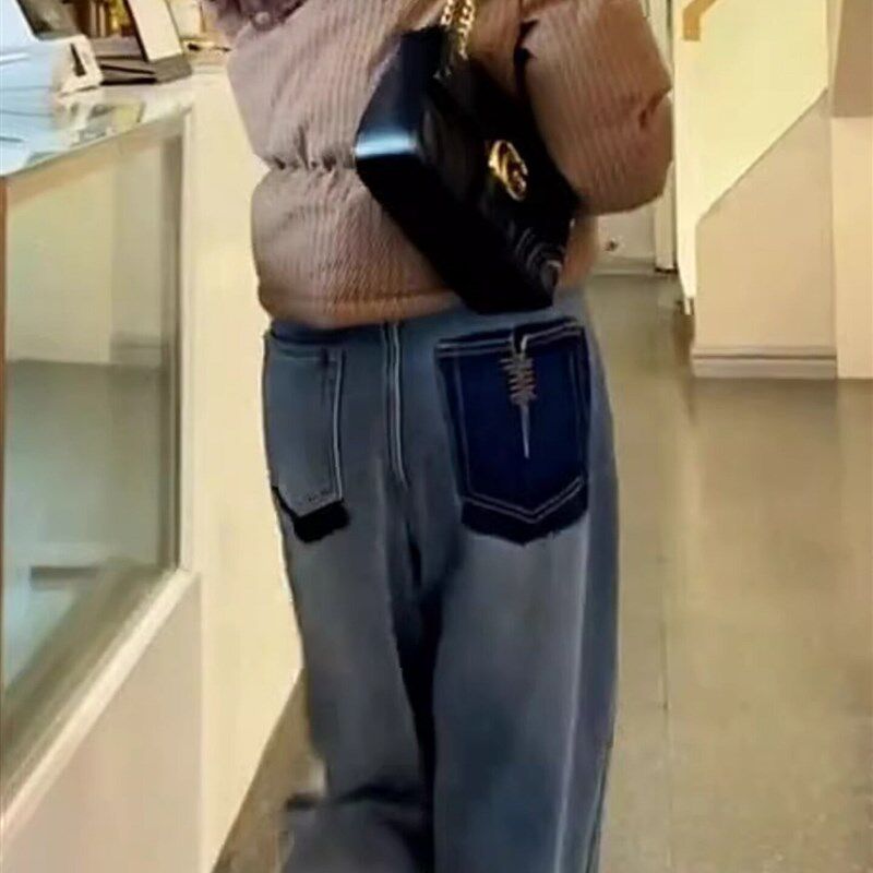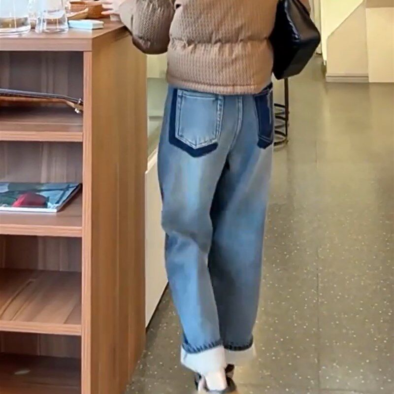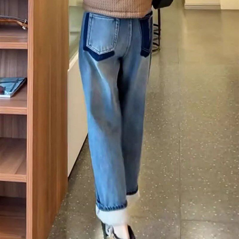 保暖显瘦高腰撞色设计感直筒老爹裤 加绒加厚哈伦牛仔裤 女秋冬新款