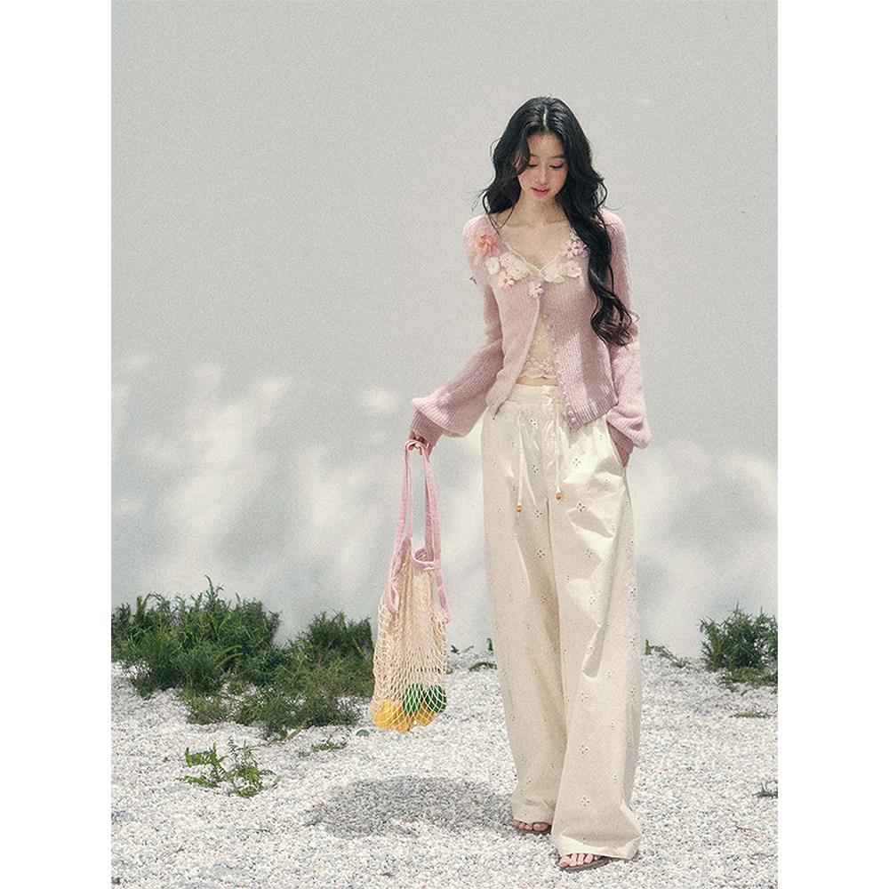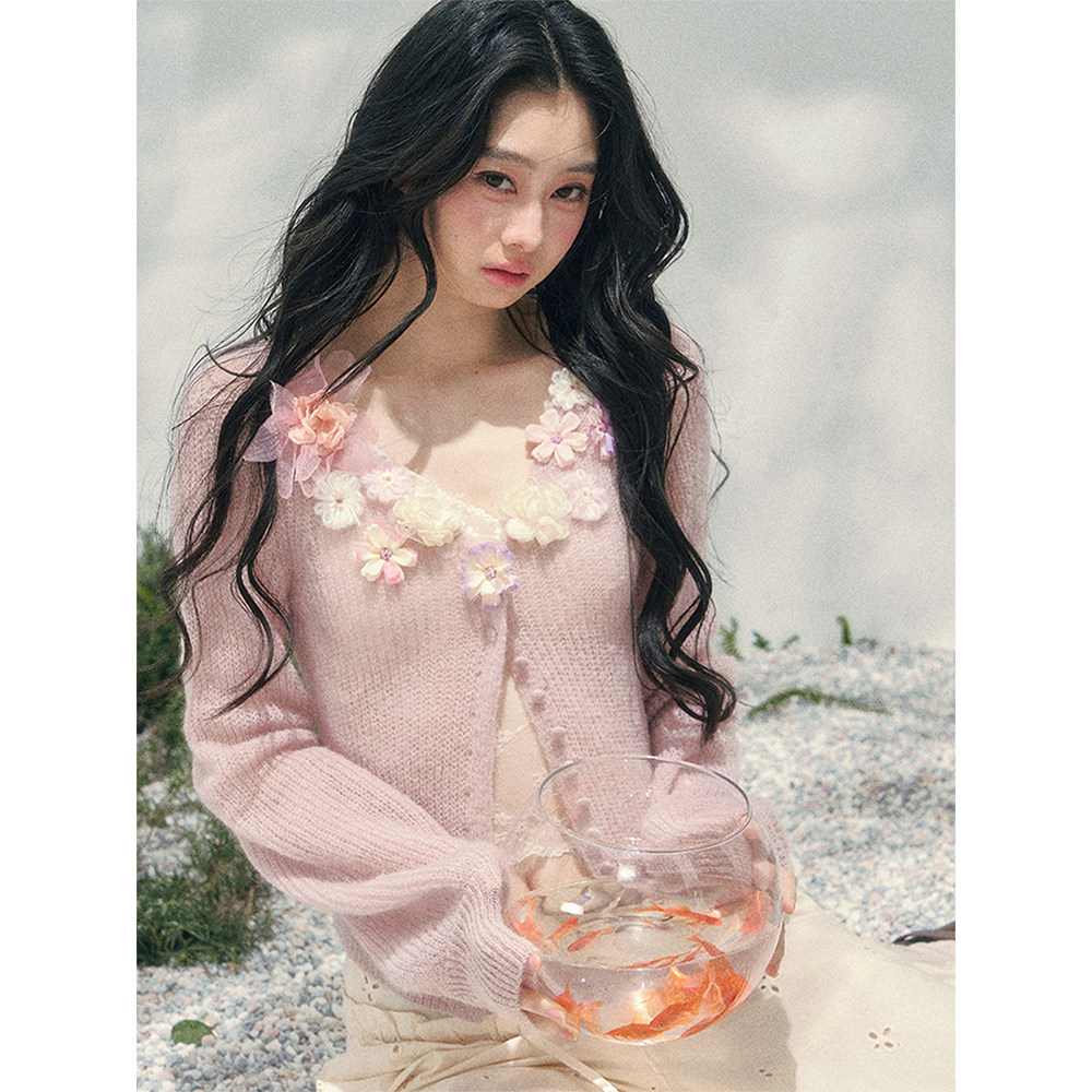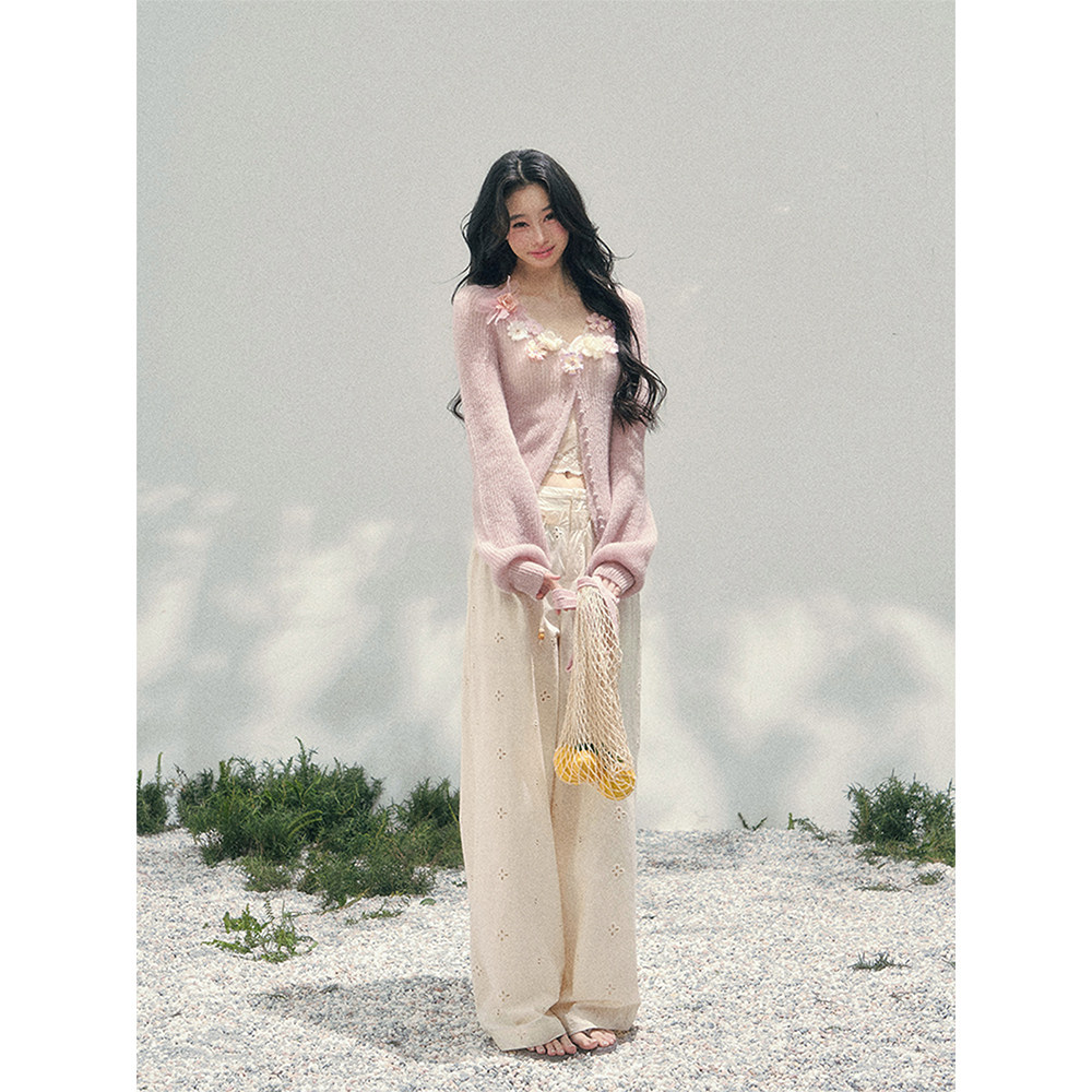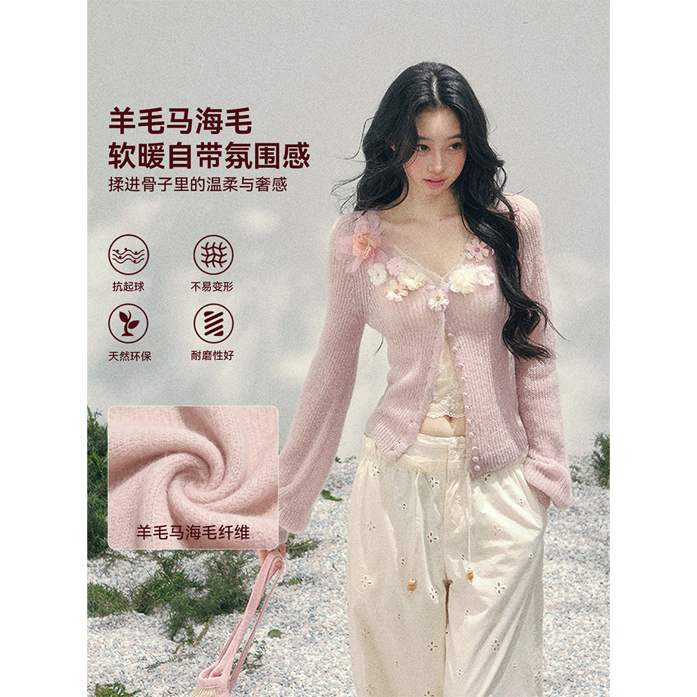 立体花朵毛衣女春季 AOMALM少也眼 针织开衫 %法式 V领上衣 春野软风