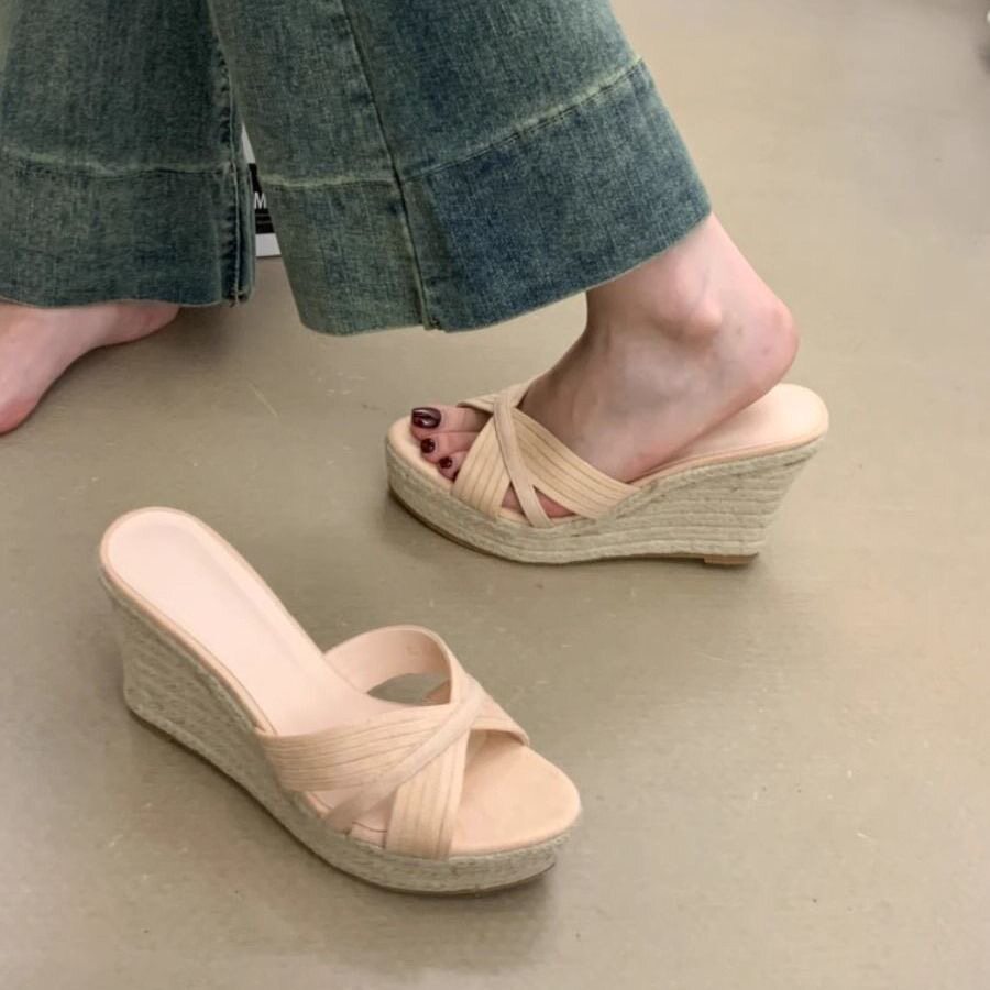 磨砂软皮超高跟厚底日系女鞋 新款 子 女仙女风夏季 草编裸色坡跟凉鞋