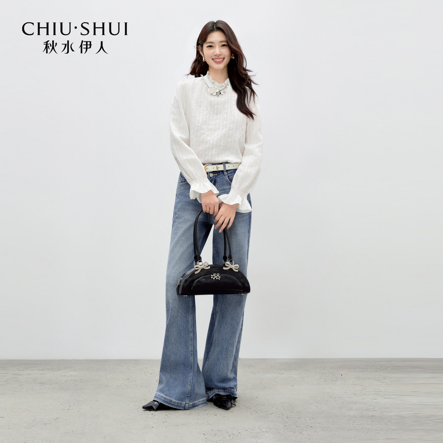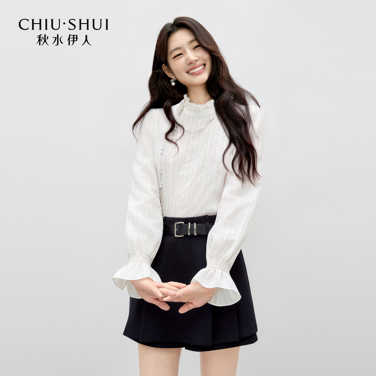 新款 2026年春季 休闲半高领褶皱上衣 口蕾丝衫 秋水伊人简约荷叶边袖
