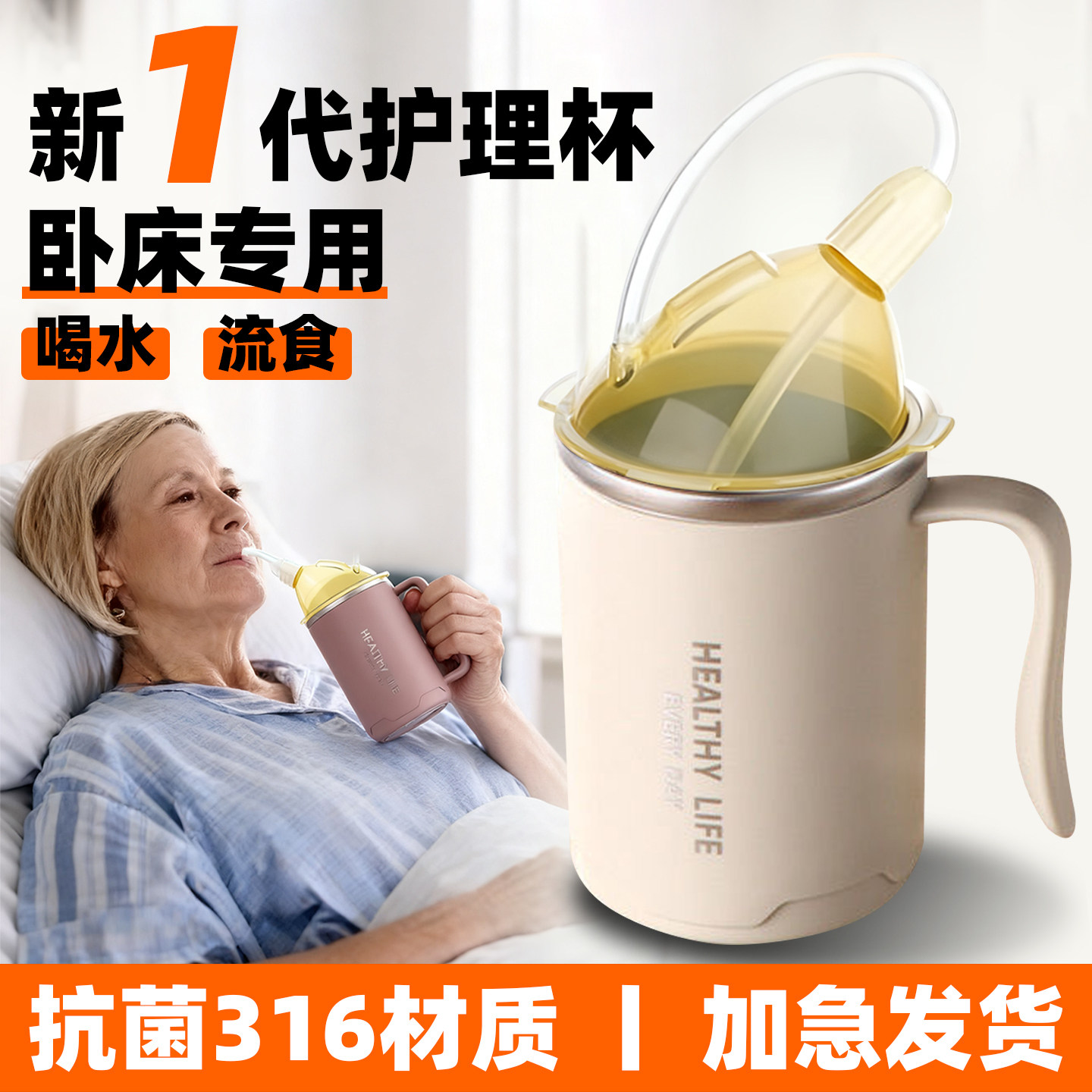 带加长吸管杯卧床老人保温杯孕妇躺着喝水防呛护理杯老人喝水神器