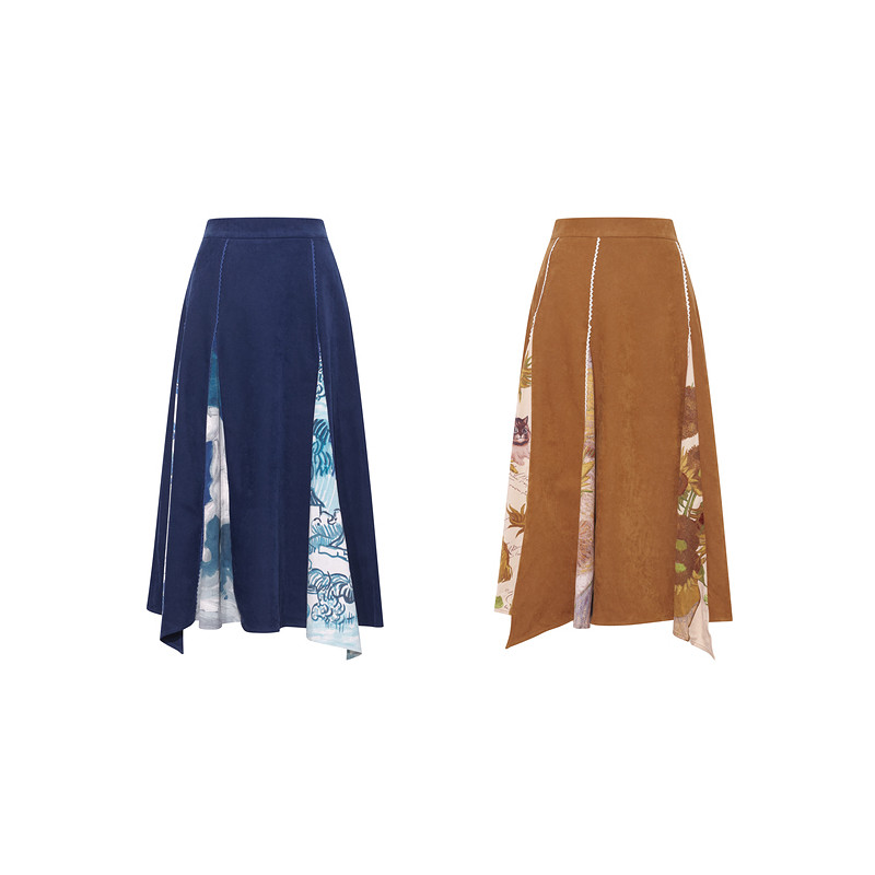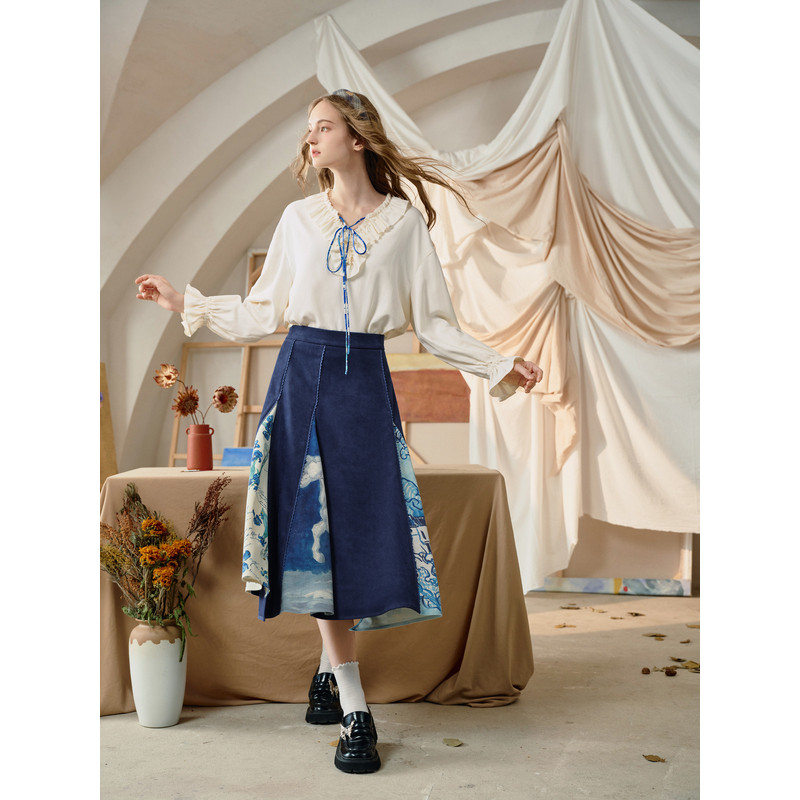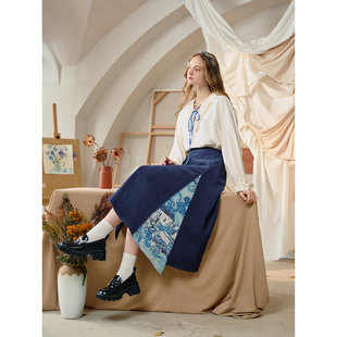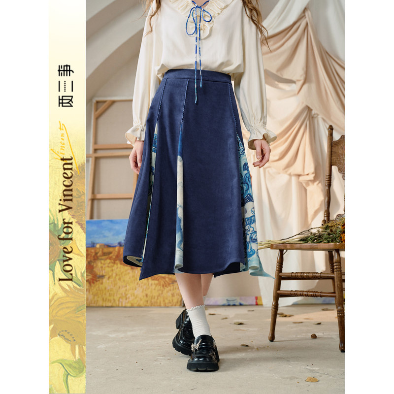 两三事梵高文艺秋风听澜印花布拼接a字半身裙长裙