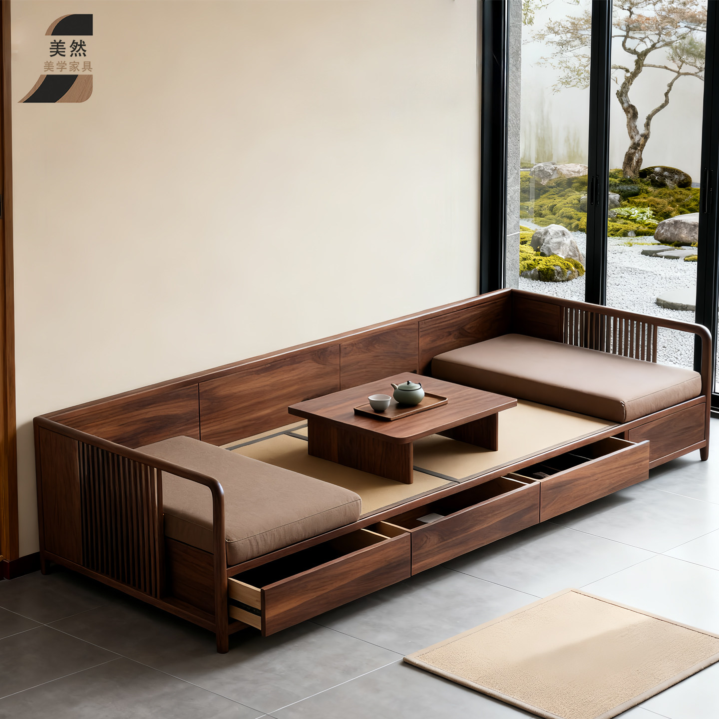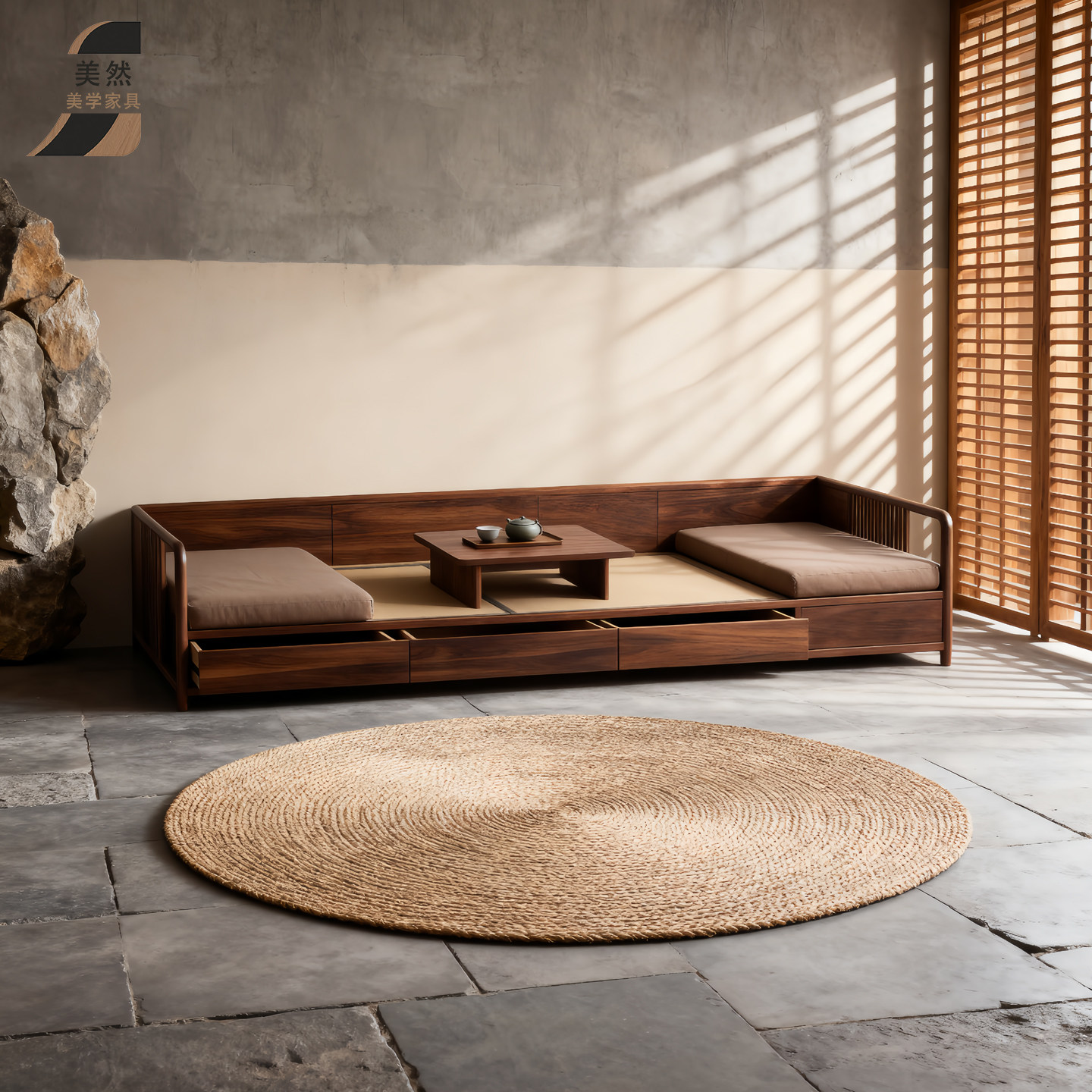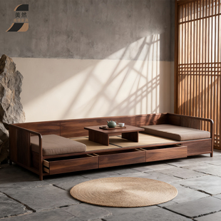 新中式 北美黑胡桃木罗汉床客厅储物现代简约禅意直排实木罗汉沙发