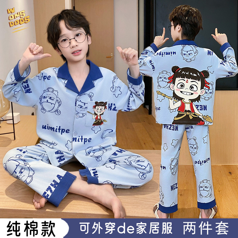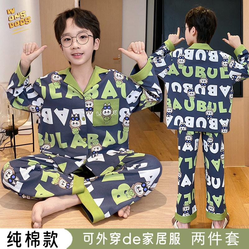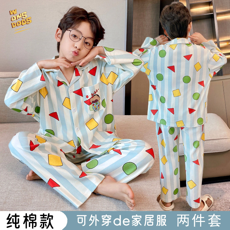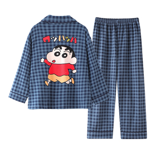 蜡笔格子纯棉儿童睡衣男童春秋长袖 男孩中大童亲子宽松家居服套装